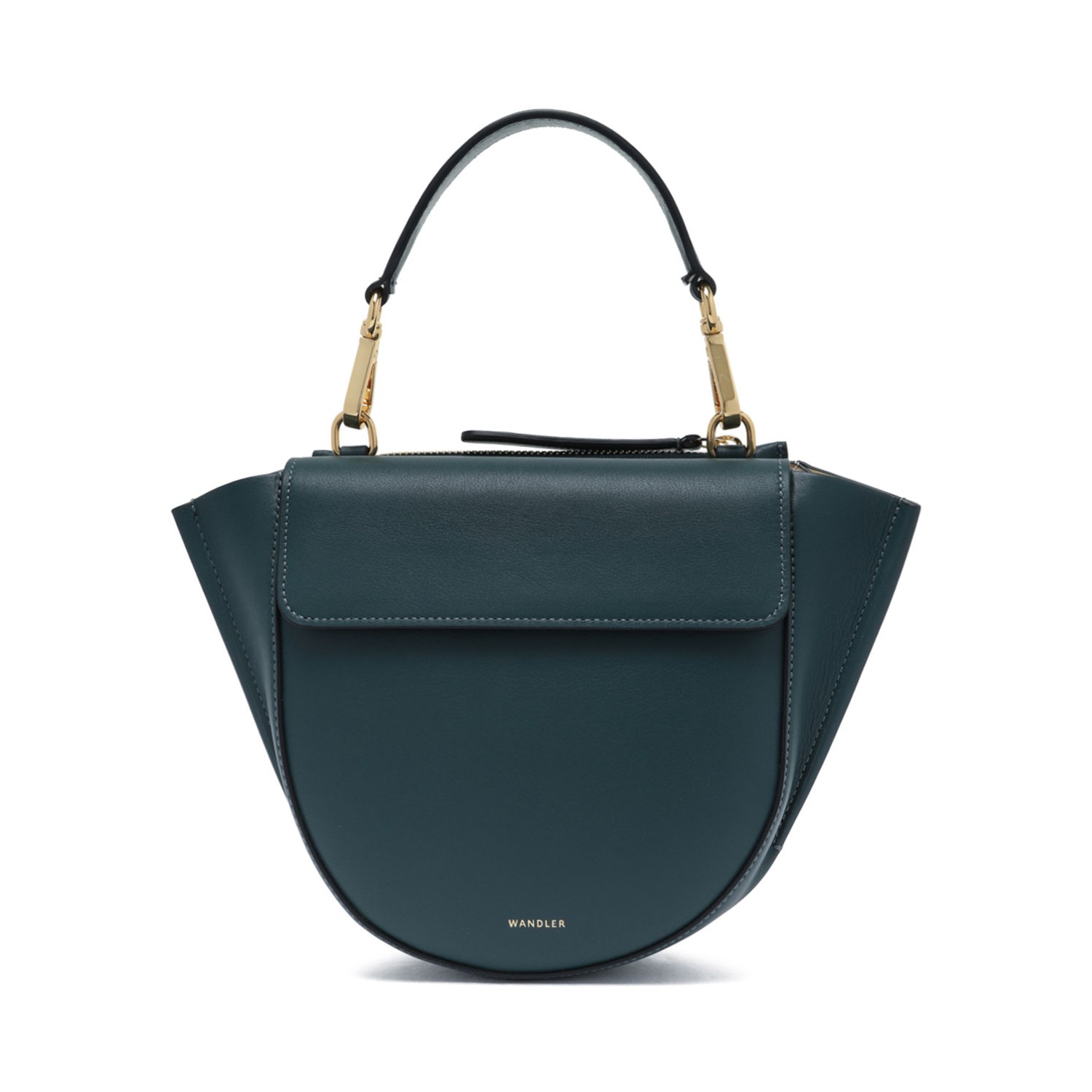 Wandler Teal Hortensia Bag. Teal bag with magnetic closure, main compartment, zip-fastening pocket. Internal slip pocket, backside zip pocket, single top handle and detachable shoulder strap.