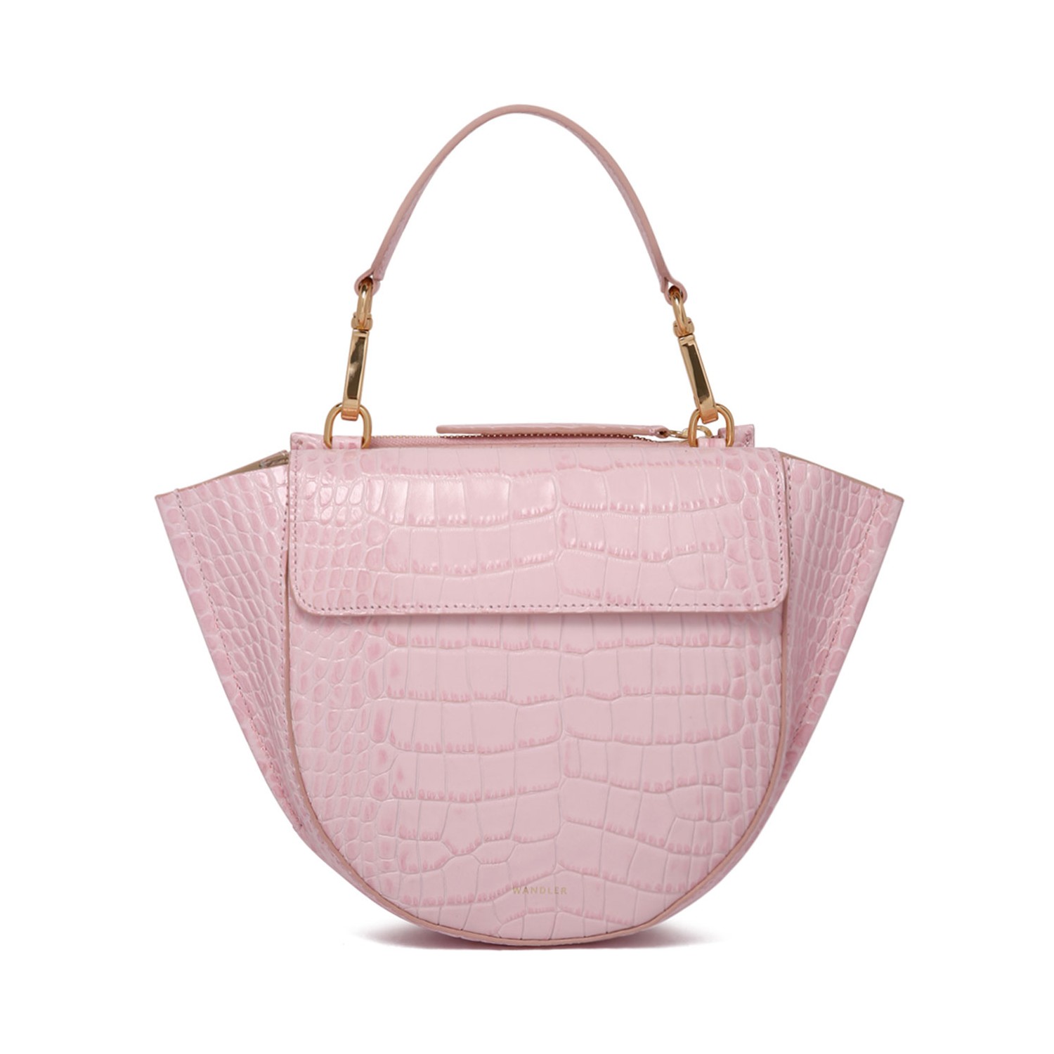 Wandler Light Pink Croco Hortensia Bag. Light pink croco bag with magnetic closure, main compartment, zip-fastening pocket. Internal slip pocket, backside zip pocket, single top handle and detachable shoulder strap.