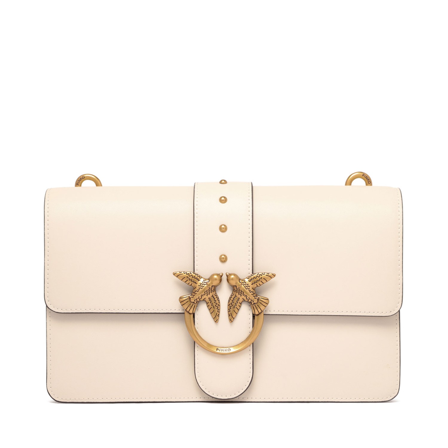 Pinko White Classic Love One Shoulder Bag. White calf leather shoulder bag with bird emebllished studded, magnetic closure, central zipped pocket. Two sections, removable strap, gold-tone logo and studded strap.