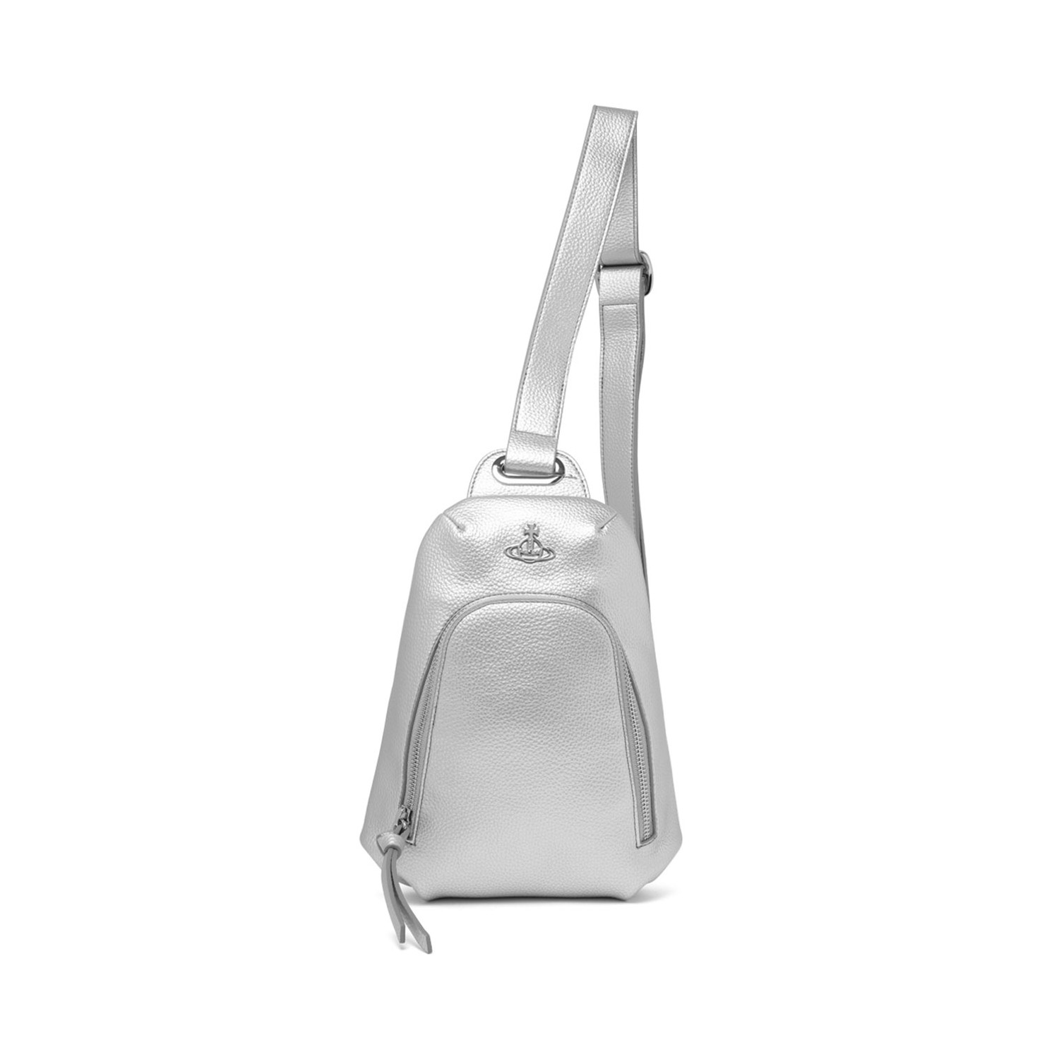 Vivienne Westwood Silver Sling Bag. The Sling bag in textured polyurethane features an Orb on the front, tone on tone strap, Line Orb Plate, zip closure.
