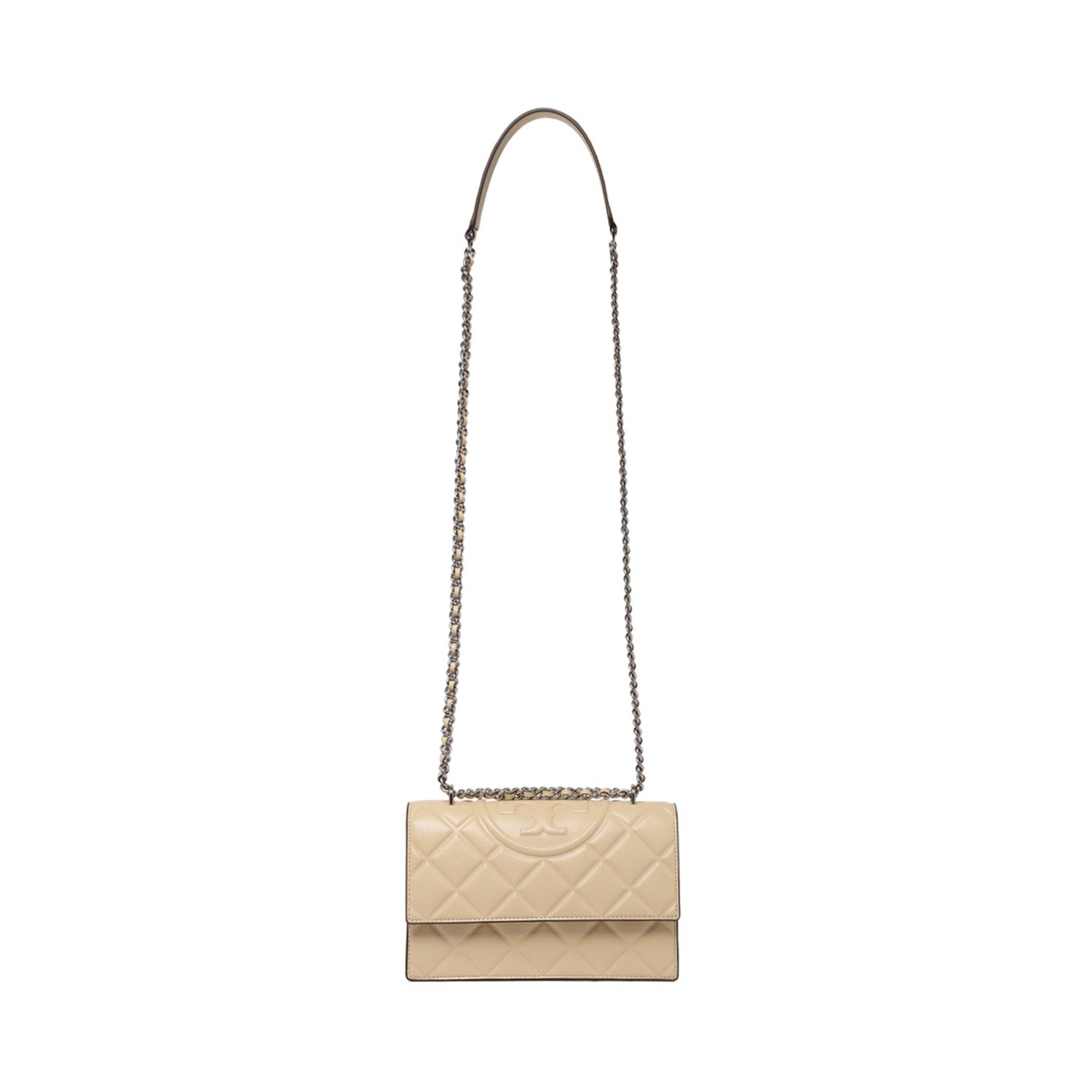 Tory Burch Small Fleming Shoulder Bag. Citron pale yellow leather shoulder bag, quilted, foldover top with magnetic fastening. Chain-link shoulder strap, embossed logo to the front, main compartment, internal zip-fastening pocket.