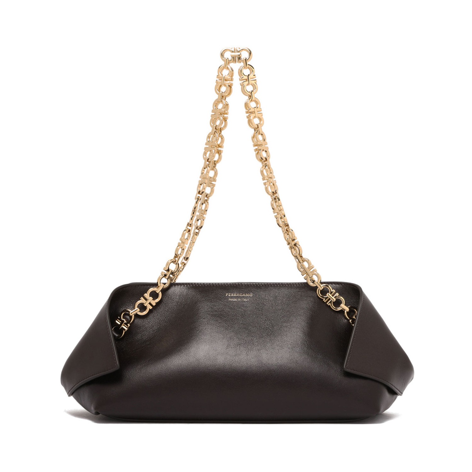 Ferragamo Brown Scarf XS Shoulder Bag. Brown folded corners that enhance soft calfskin leather, accented by a gold logo shoulder strap. A double-slider zip reveals a lined interior with a zip pocket, finished with a signature charm and covered key fob.