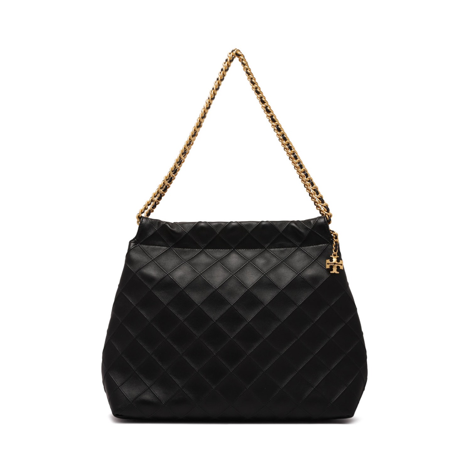 Tory Burch Black Fleming Drawstring Bag. Black drawstring soft bag crafted with diamond-shaped pleats and a woven chain shoulder strap. Microfiber lining with suede-like finish, magnetic closure, braided handles in double chain and leather. One internal pocket on the front side, one internal zip pocket.