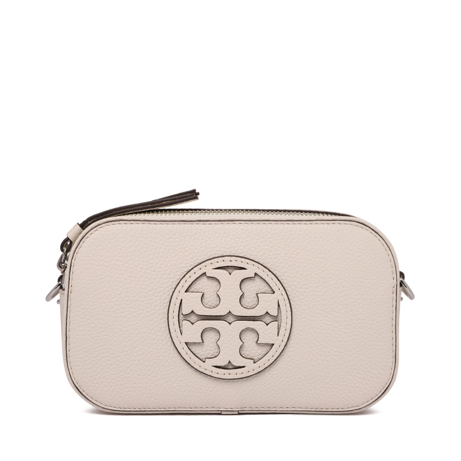 Tory Burch New Ivory Miller Mini Shoulder Bag. New ivory hammered leather mini shoulder bag with microfiber lining with suede-like finish. Double zip closure, adjustable and removable shoulder strap, height 56.5 cm. Two open compartments, one internal slip pocket on the back side.