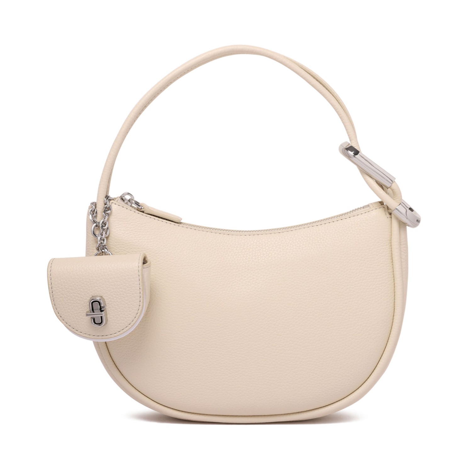 Marc Jacobs Cloud White The Dual Hobo Bag. Cloud white slouchy crescent-shaped shoulder bag with Dual-inspired detailing and a sleekly minimalistic silhouette. Featuring signature handle-adorning Dual hardware and removable earbud case bag charm, this elevated leather staple is timeless sophistication embodied.