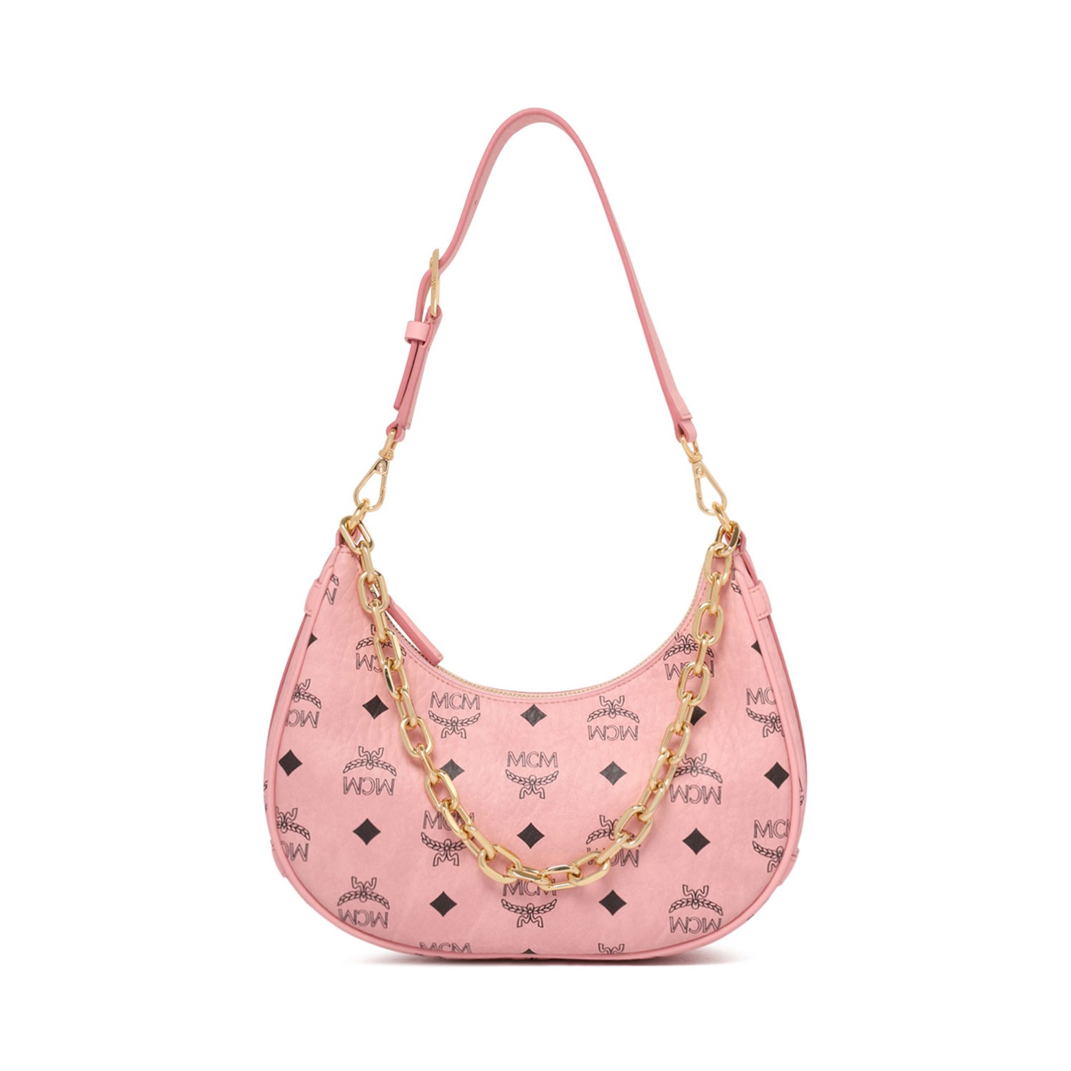 MCM Light Pink Monogram Print Shoulder Bag. Light pink calf leather shoulder bag with top zip fastening, single chain-link top handle. Adjustable detachable shoulder strap and main compartment.