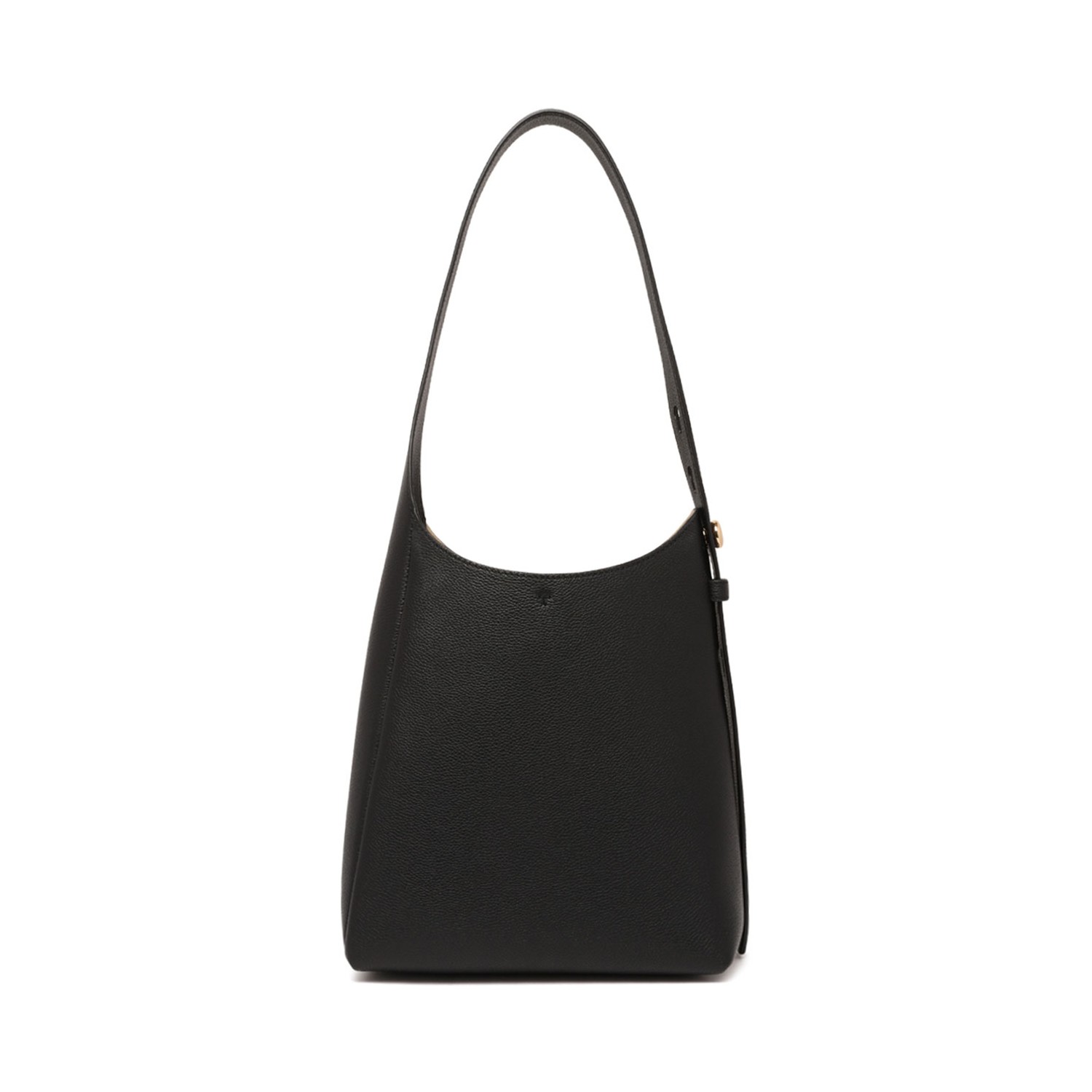 Tory Burch Black Romy Small Hobo Bag. Black small hobo bag made of soft hammered leather with microfiber lining with suede-like finish, clip closure, adjustable shoulder strap and internal zip pocket.