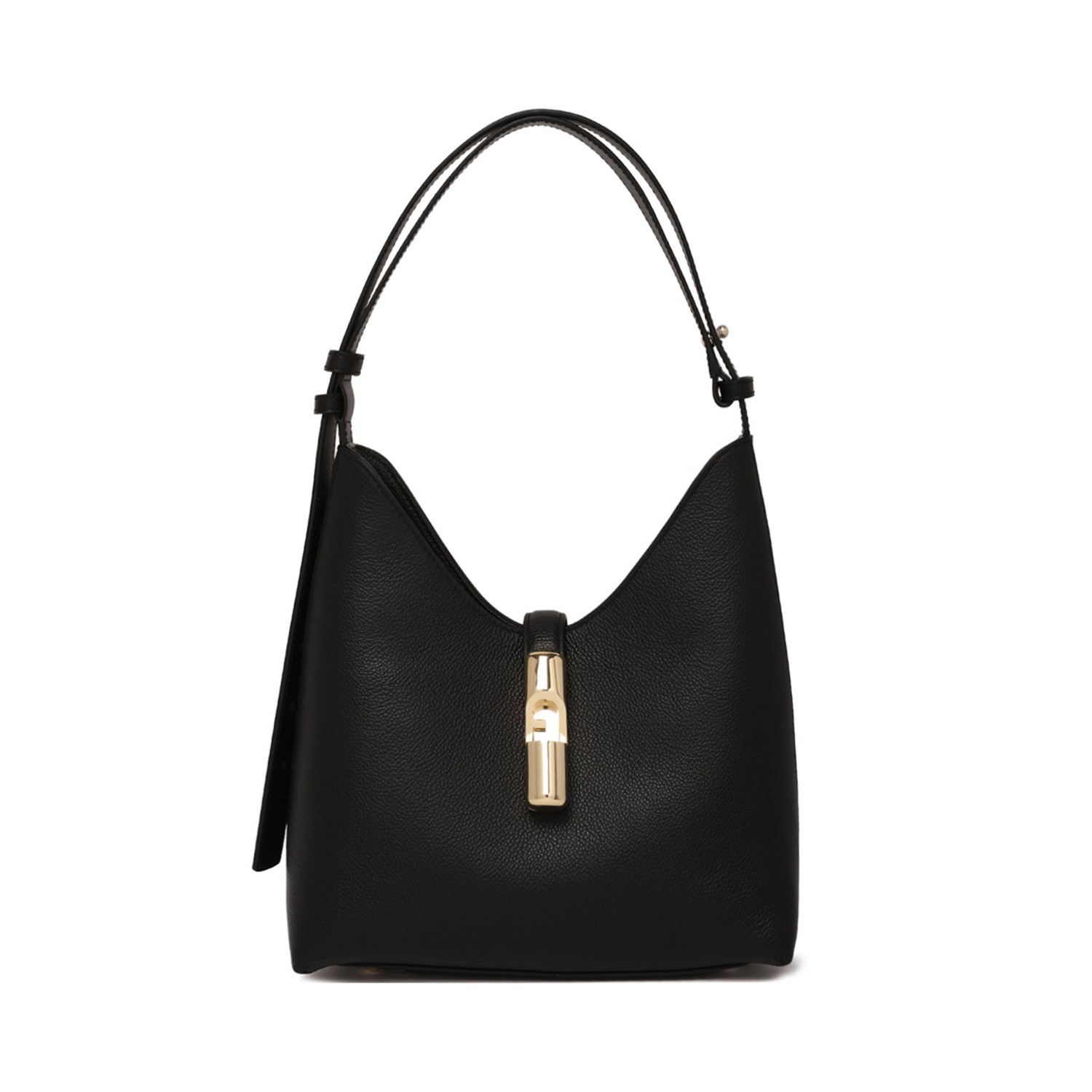 Furla Black Goccia Shoulder Bag S. Black Goccia hobo bag stands out for its soft, deconstructed silhouette crafted from smooth leather and printed calfskin. The bag is embellished with a matching strap and an adjustable, contrasting leather handle. The new cylindrical hardware with a weight and Furla Arco logo elegantly closes the bag.