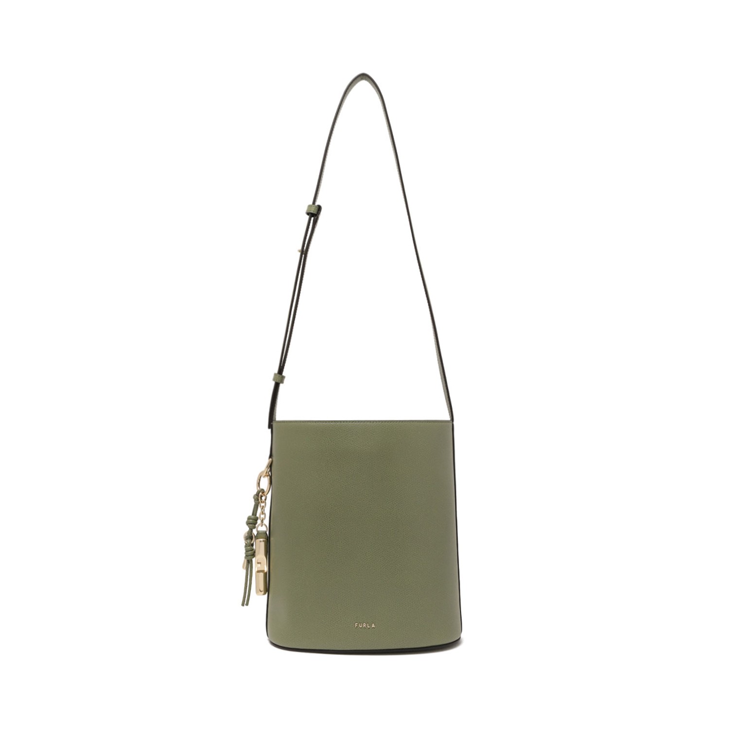 Furla Avocado Roxie Bucket Bag S. Avocado small and compact bucket bag perfect for carrying your essentials. The soft and flexible bottom makes the structured design stand out thanks to the fine leather with a printed finish. Ideal for carrying by hand, it also doubles as a crossbody bag thanks to the fixed and adjustable shoulder strap with a mushroom-shaped closure. The removable cylindrical charm with two braided cords adds a distinctive touch to the accessory.