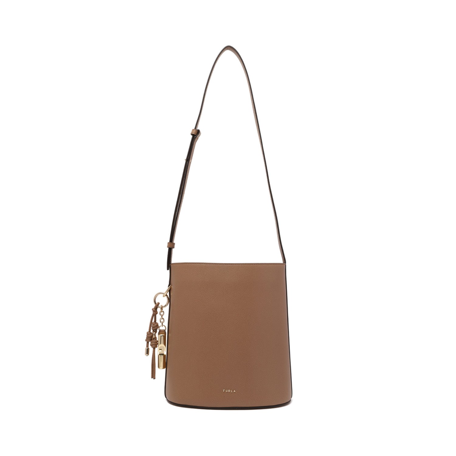 Furla Toffee Roxie Bucket Bag S. Toffee small and compact bucket bag perfect for carrying your essentials. The soft and flexible bottom makes the structured design stand out thanks to the fine leather with a printed finish. Ideal for carrying by hand, it also doubles as a crossbody bag thanks to the fixed and adjustable shoulder strap with a mushroom-shaped closure. The removable cylindrical charm with two braided cords adds a distinctive touch to the accessory.