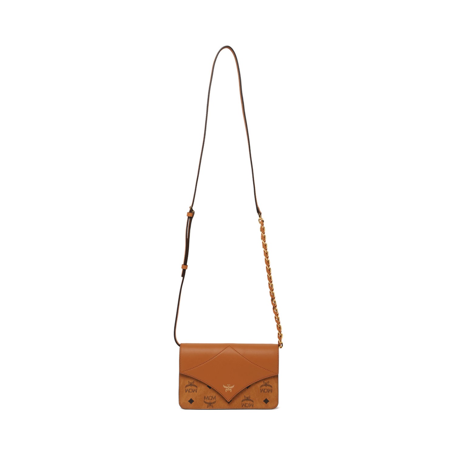 MCM Cognac Diamond Visetos Mini Shoulder Bag. Cognac mini shoulder bag with logo print on the front, hinged top with magnetic closure, leather shoulder strap with chain. Single compartment, gold-colored details, logo print on the back and internal bellows pocket.