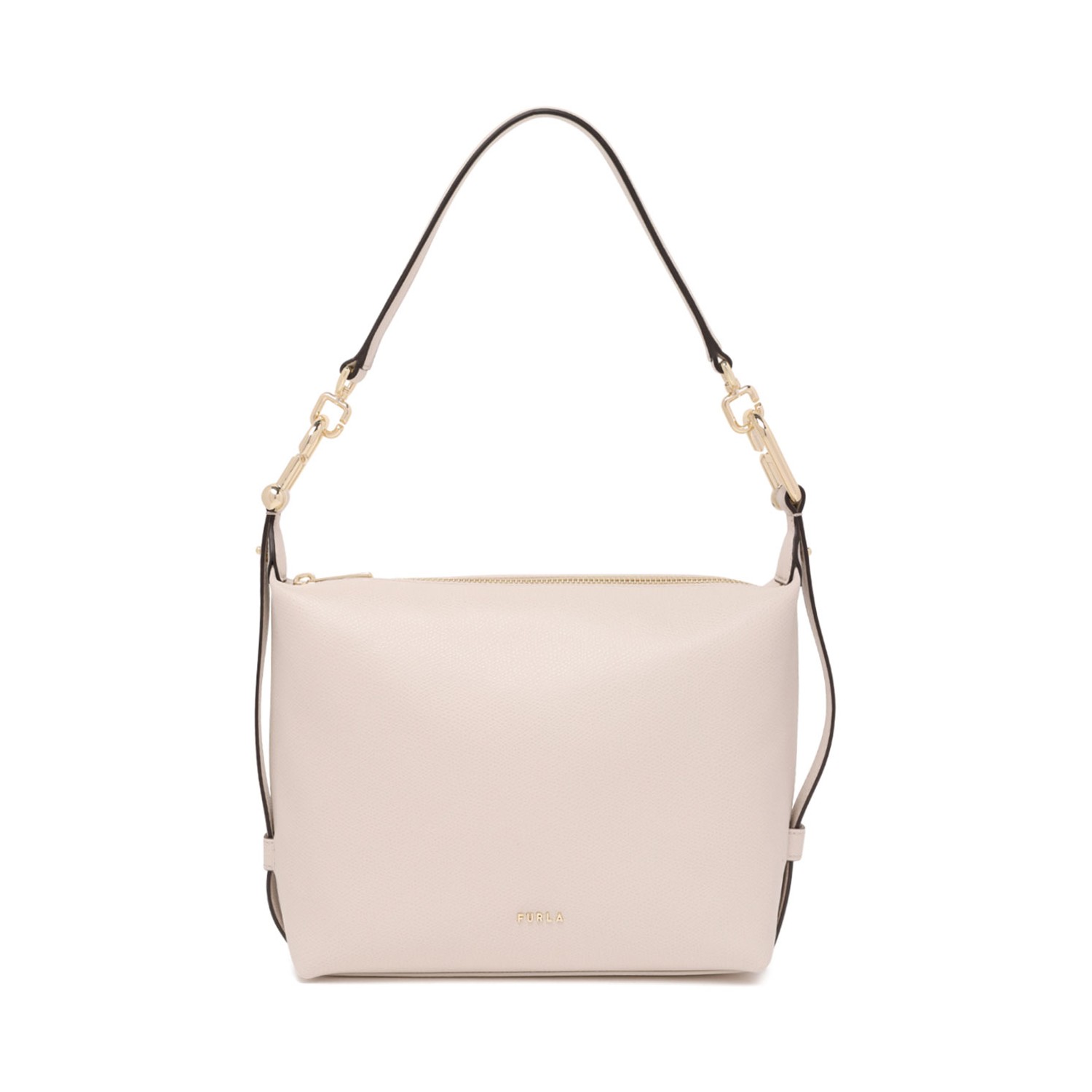 Furla Sand Tonie Mini Shoulder Bag. Tonie hobo bag features a miniature format in fine printed leather. Featuring two shoulder straps of different lengths, it can be worn over the shoulder or crossbody. By removing the handle, the two Arco logo-shaped elements can be attached together for a new and distinctive top handle version.
