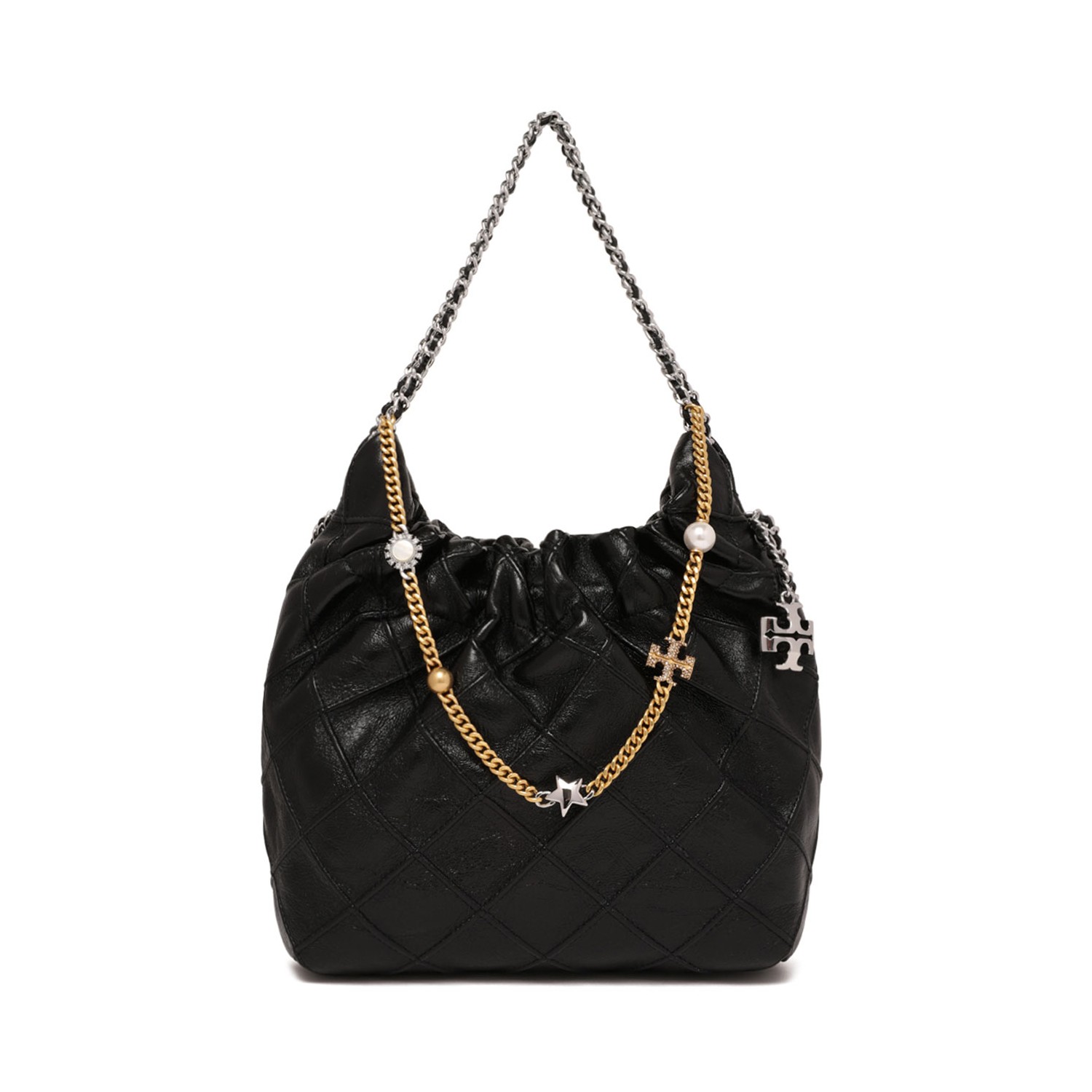 Tory Burch Black Fleming Distressed Mini Hobo Bag. Crafted from black nappa leather for a distressed look, the Fleming mini drawstring bag features diamond-patterned pleats and a chain and woven leather shoulder strap.