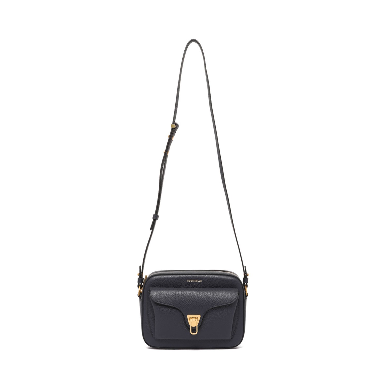 Coccinelle Midnight Blue Beat Soft Crossbody Bag. Midnight blue crossbody bag in grained leather with galvanised old gold details. Fabric interior with zipped pocket. Iconic golden clasp. Logo with gold stamp. Adjustable shoulder strap.
