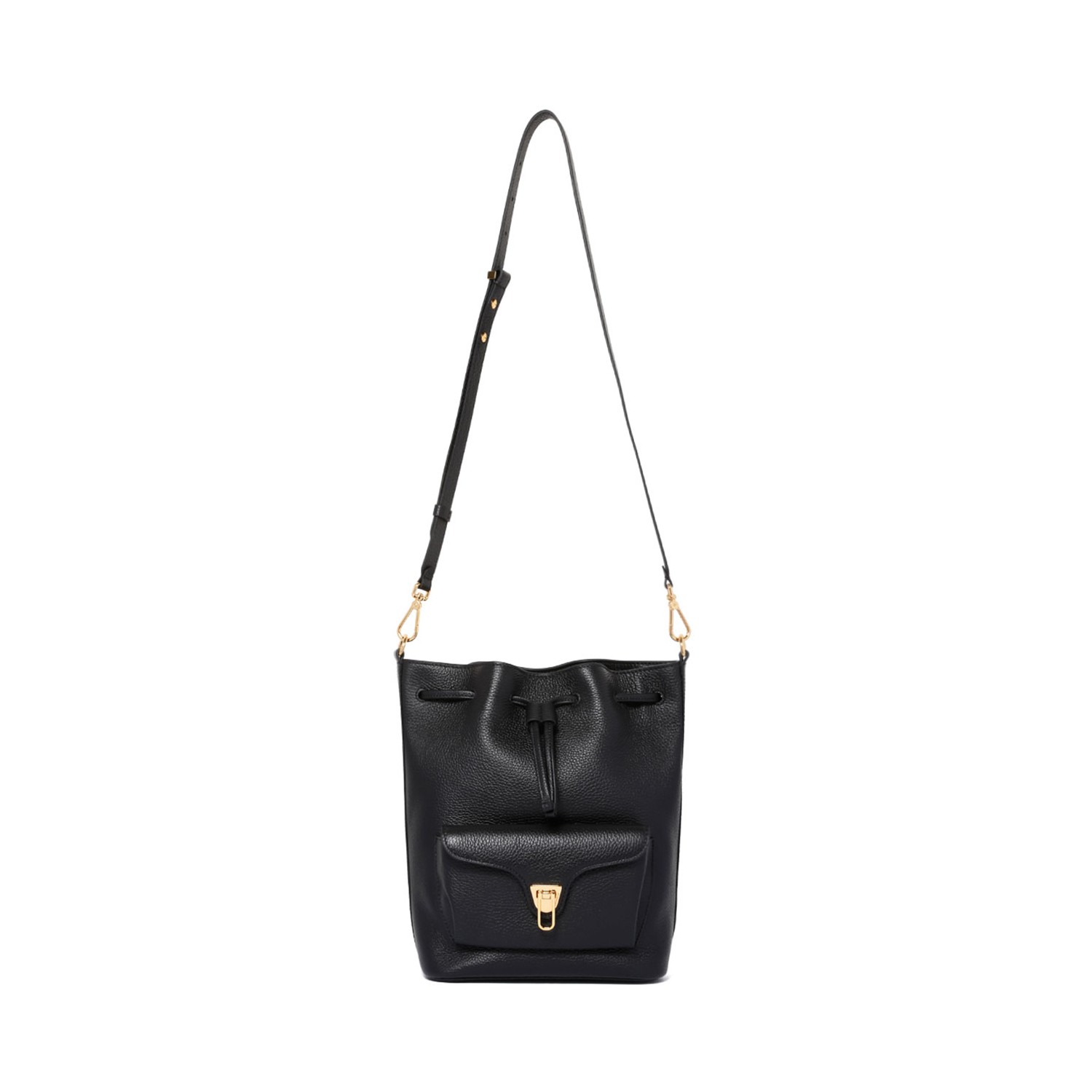 Coccinelle Black Beat Generation Medium Bag. Black grained leather medium bag with drawstring closure, adjustable and removable handle for dual portability. External front pocket with iconic closure, internal zip pocket, gold plating, gold stamp logo.