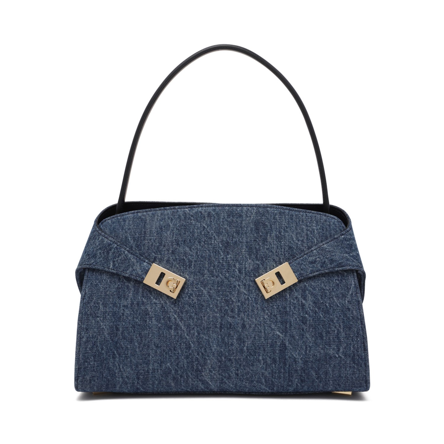 Ferragamo Midnight Blue Hug Soft Shoulder Bag. Midnight blue cotton blend shoulder bag with single handle, gold-finish Gancini buckles, flap with magnetic closure and T-bar. Adjustable and removable shoulder strap.