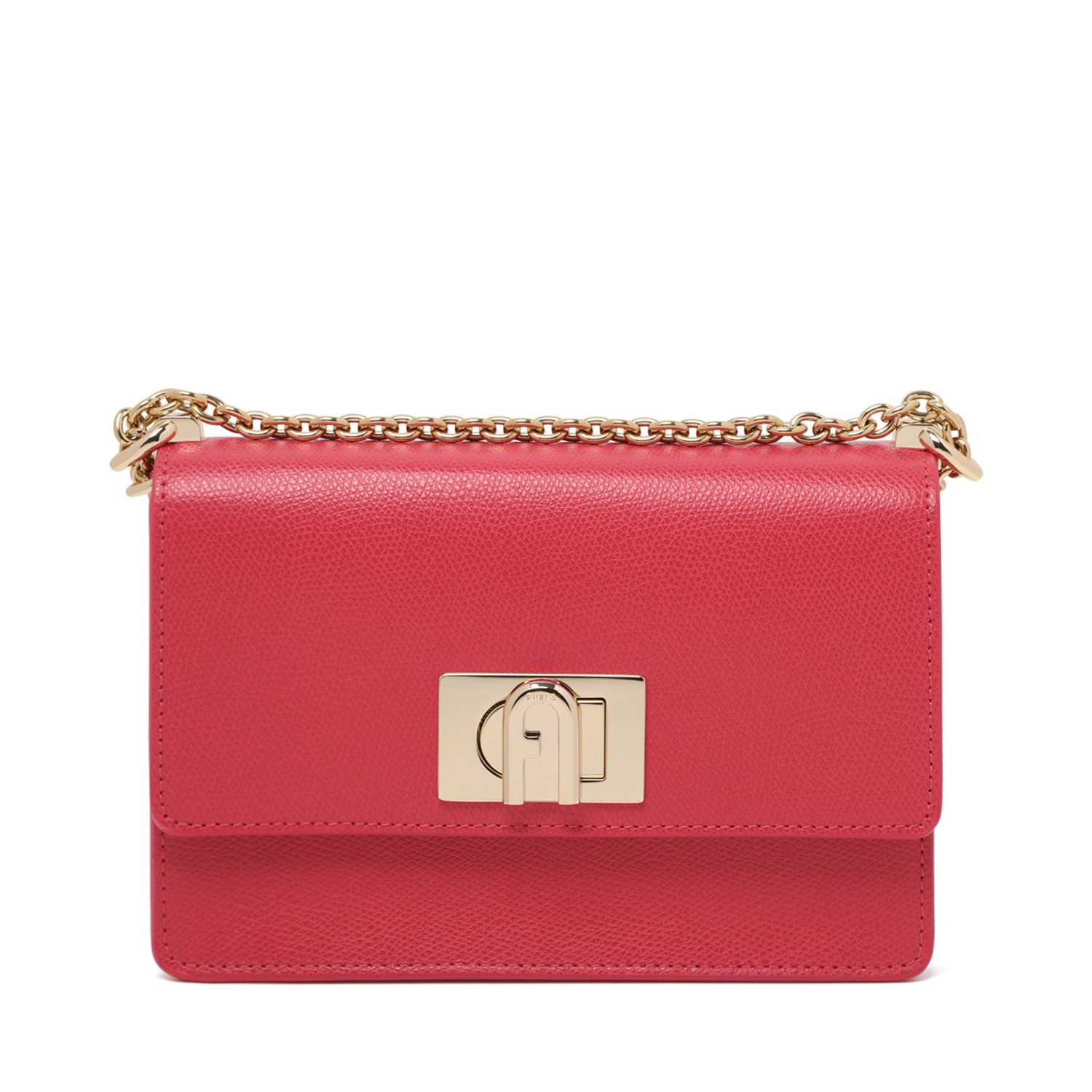 Furla Velvet Pink 1927 Mini Crossbody Bag. Velvet pink calf leather crossbody bag, gold tone hardware, tonal stitching. Slip pocket to the rear, foldover top, flip lock fastening, leather and chain link shoulder strap. Full lining, main compartment, internal logo tag, internal slip pocket.