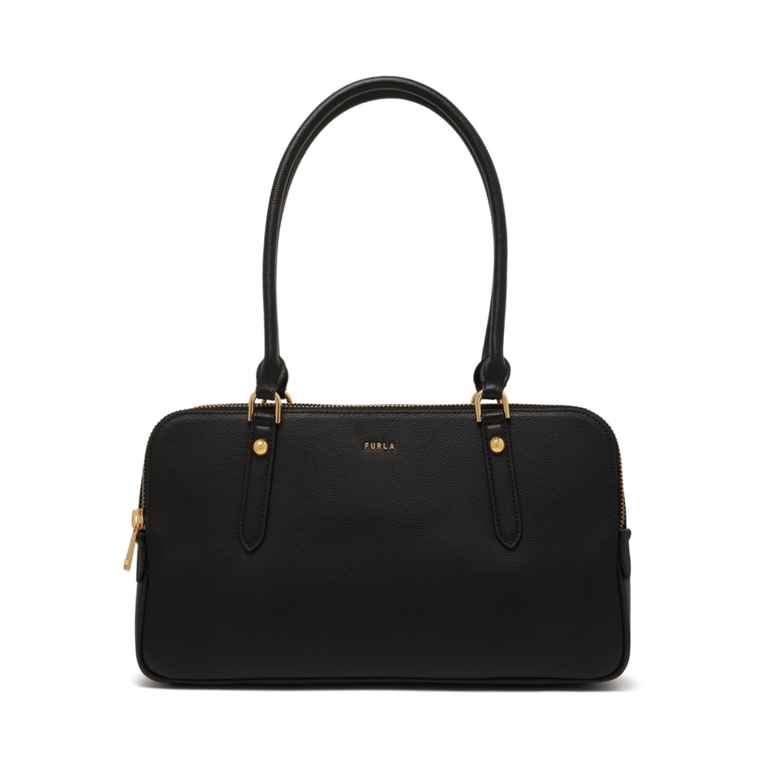 Furla Black Giulia Boston M Bag. Black Giulia satchel features square lines and a horizontal design. Crafted from premium printed leather combined with suede inserts along the double zip closures, it features a spacious interior to hold your laptop and documents. Adjustable handles allow the bag to be worn over the shoulder or as a top handle.