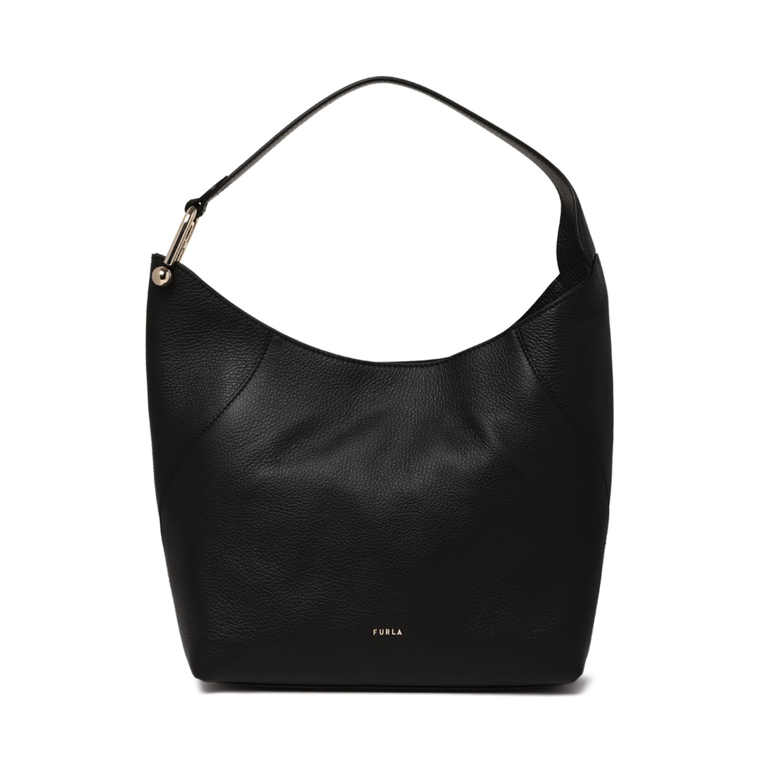 Furla Black Lara Shoulder Bag M. Black hobo bag crafted from premium hammered leather with a rich, natural feel, it's embellished with the iconic metal Arco sphere logo on the shoulder strap. The bag is spacious enough to hold your essentials.