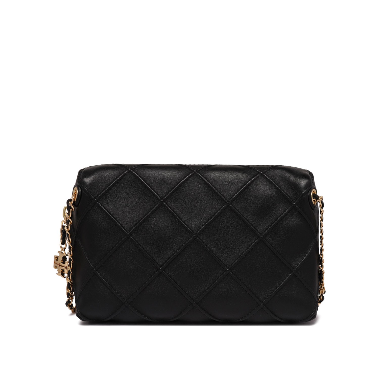 Tory Burch Black Fleming Soft Shoulder Bag. Black leather shoulder bag with zip closure, removable shoulder strap in interwoven leather and chain, height 56.5 cm. One internal card compartment, logo pendant and tuck quilting technique.