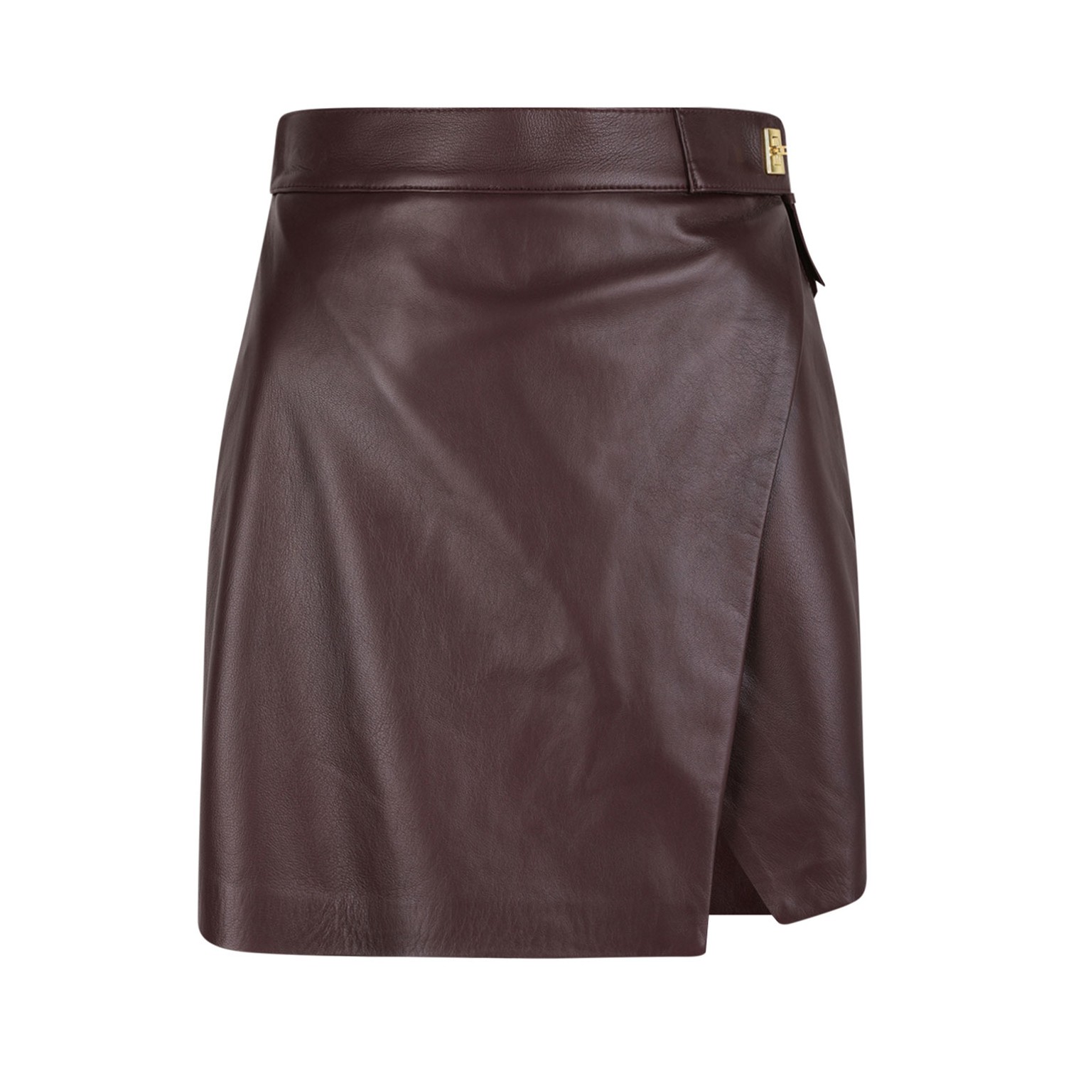 Elisabetta Franchi Merlot Short Nappa Leather Skirt. Black short nappa leather skirt with a wraparound and regular fit. With a slit to give a bold silhouette, it is embellished with a turn-lock logo detail decorating the side.