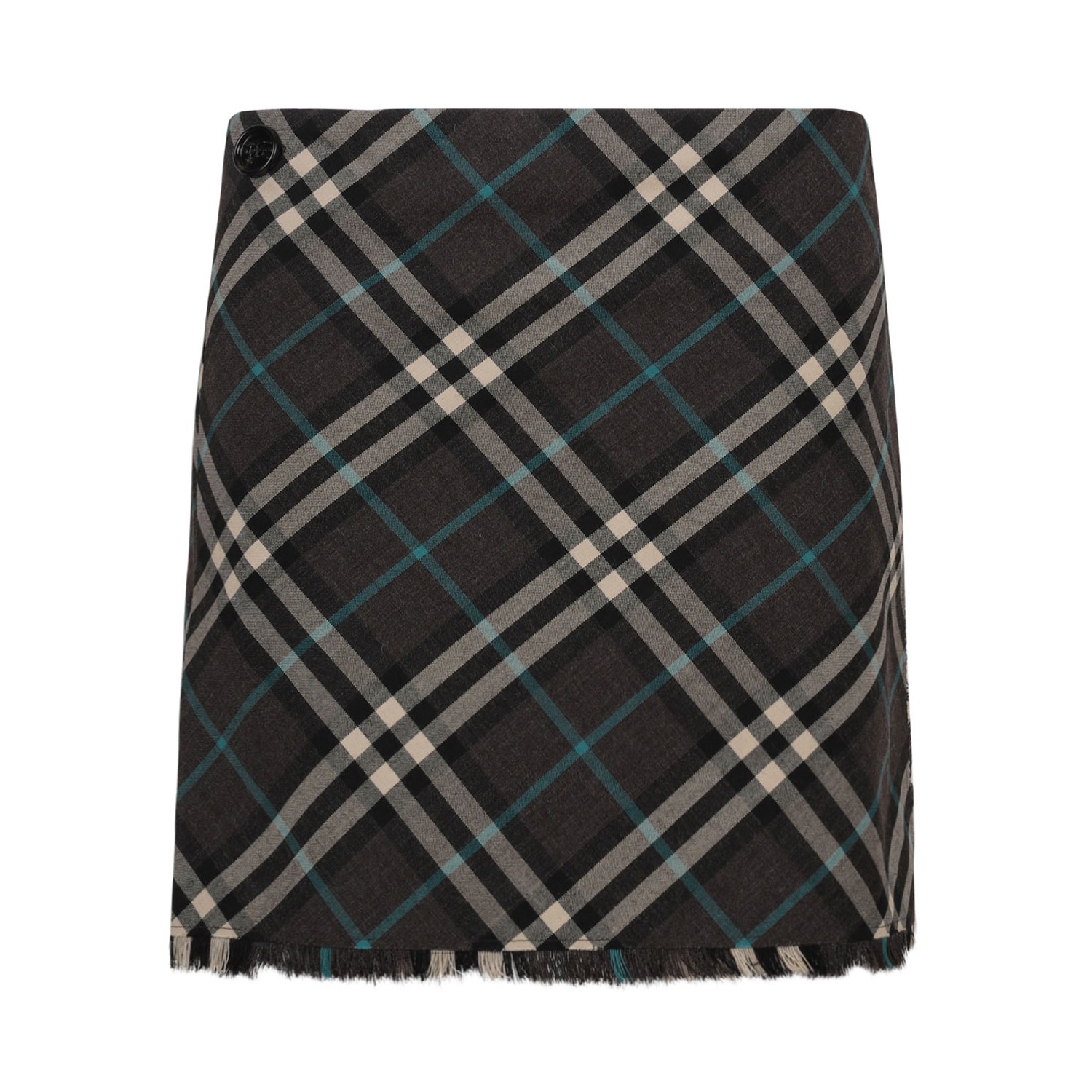 Burberry Check Pattern Mini Skirt. Dark grey and sand beige leather mini skirt, fully pleated, check pattern. Frayed edge, side buckle fastening, thigh length.