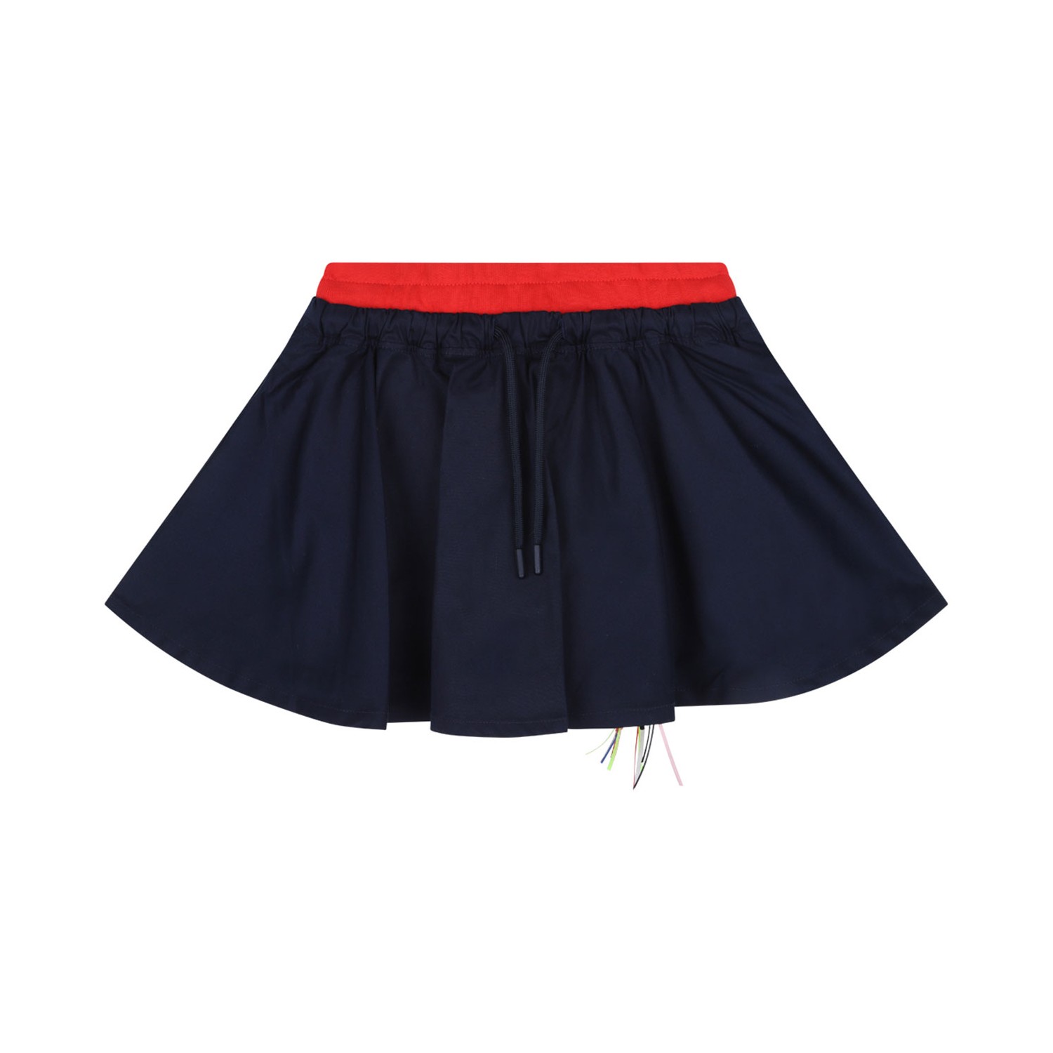 MSGM Kids Navy Blue Mini Skirt. Navy blue cotton layer detailed mini skirt with elasticated drawstring waistband, embroidered logo to the front, flared, inner shorts.