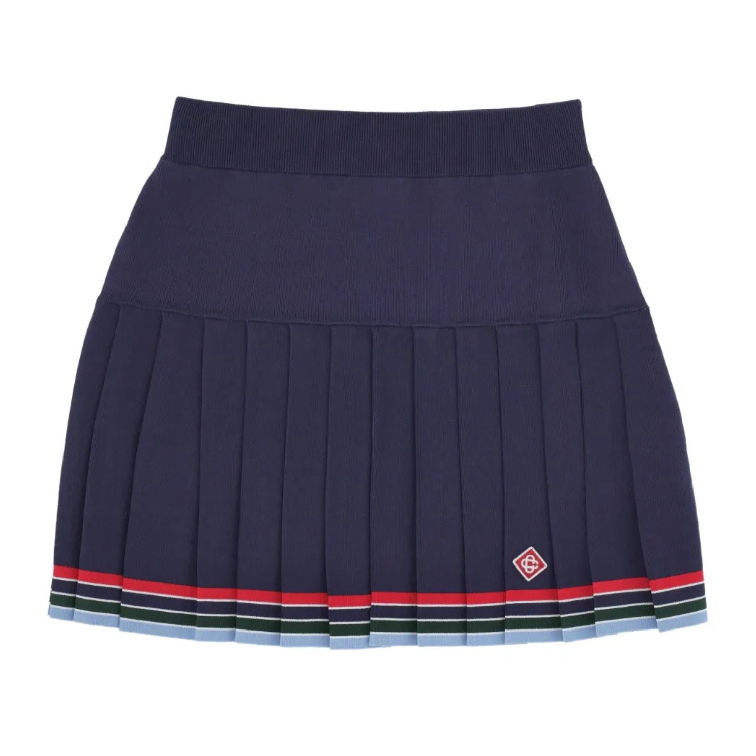 Casablanca Pleated Mini Skirt. Navy blue pleated mini skirt with ribbed waistband, applique logo, stripe detailing.