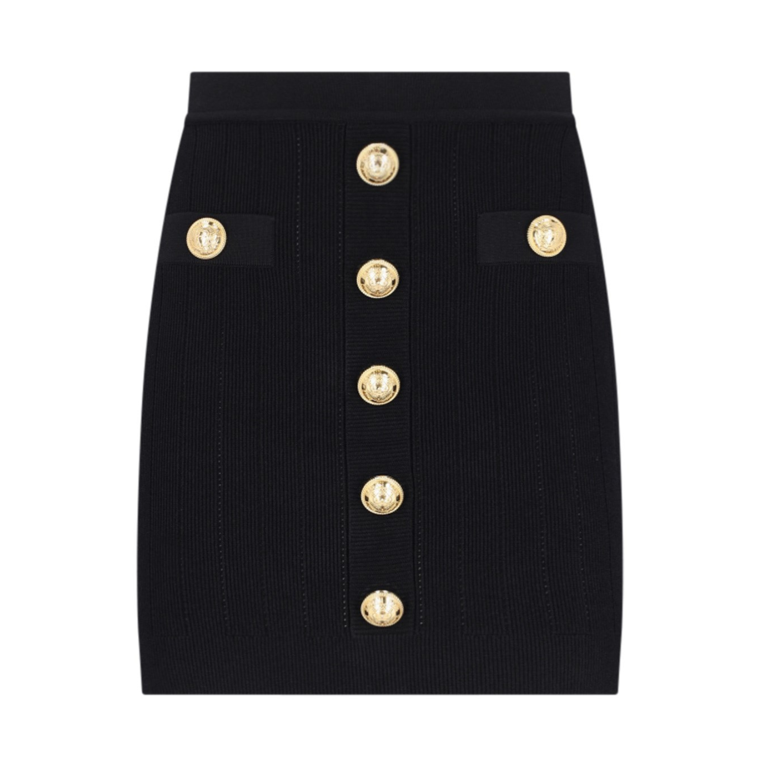 Balmain Black High Waist Miniskirt. Black knitted construction miniskirt, faux pocket detail, embossed gold-tone buttons. Ribbed trim, high waist, rear zip fastening. Straight hem and thigh-length.