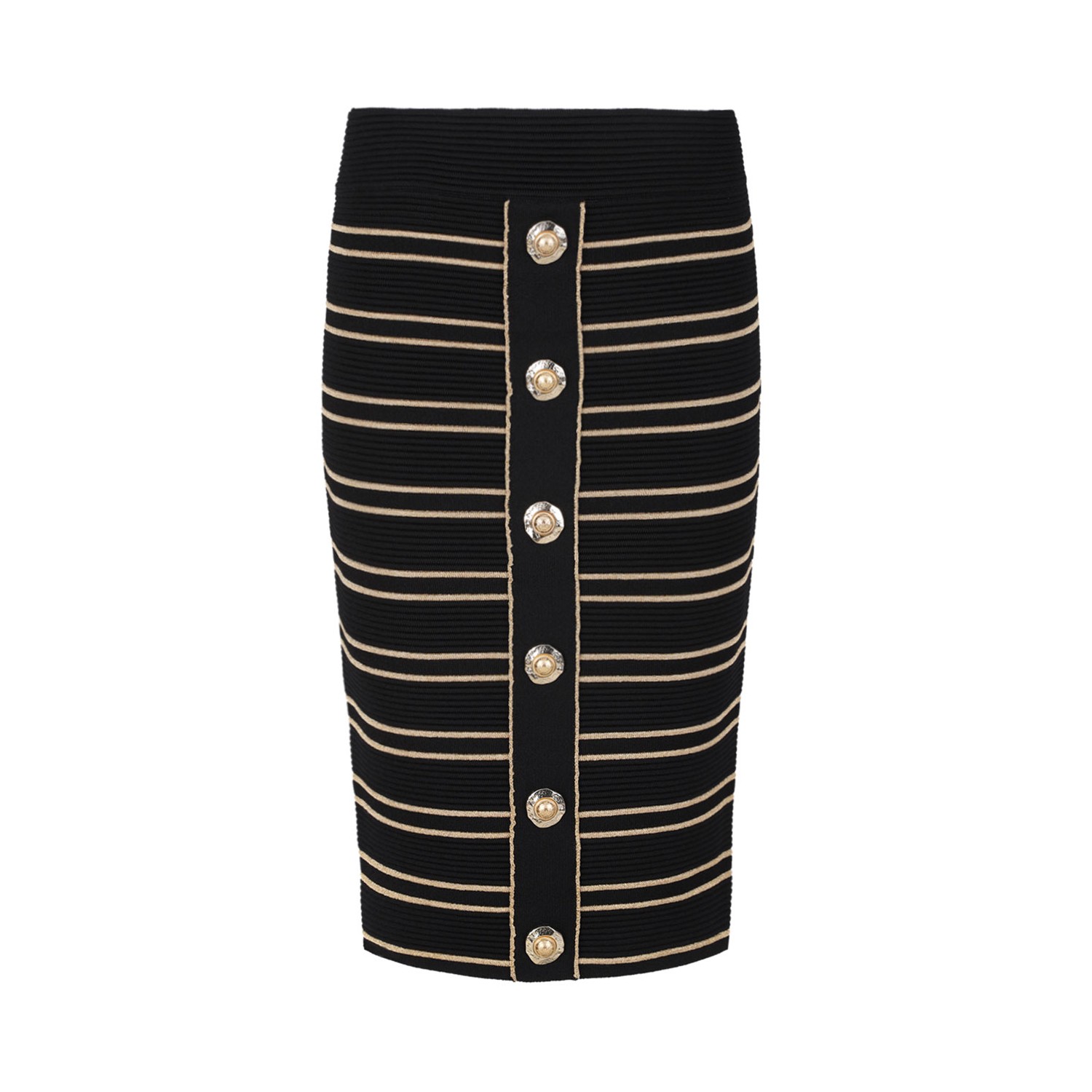 Balmain Black and Gold Striped Skirt. Black and gold striped skirt with button details to the front, elasticated waistband and rear zip fastening.