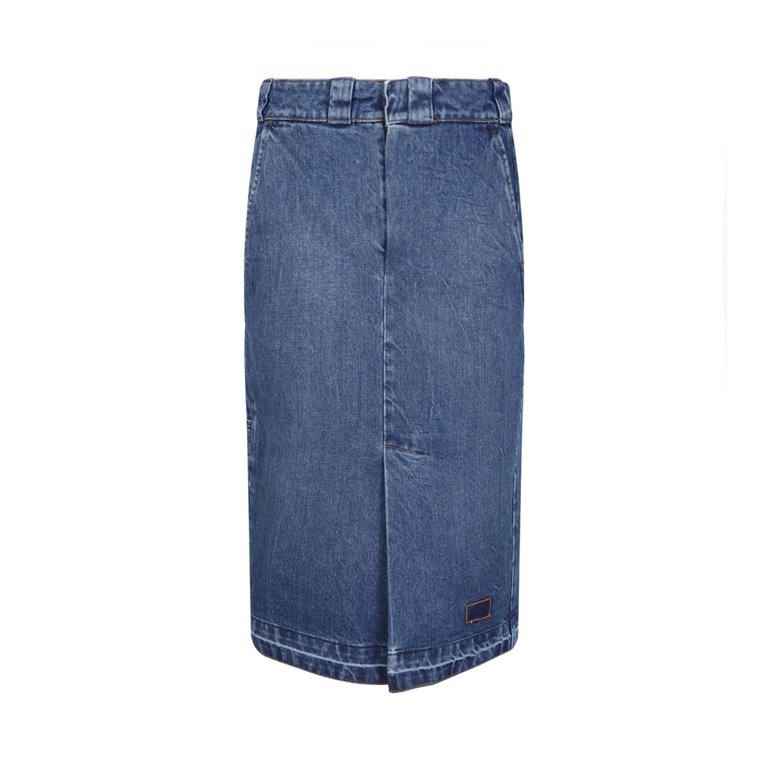 Maison Margiela Blue Denim Pencil Skirt. Blue cotton denim pencil skirt with high waist, belt loops, midi length, decorative front stitching.