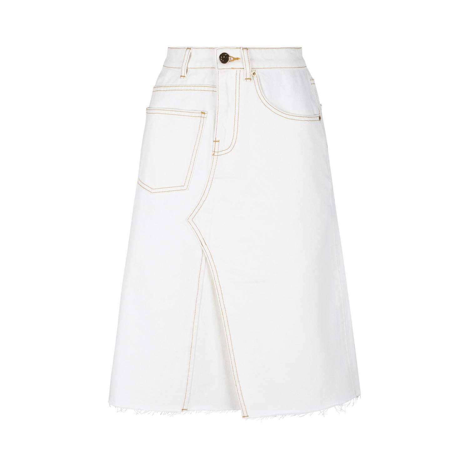 Tory Burch White Denim Skirt. White denim skirt, contrast stitching, belt loops. Side slit pocket, side patch pocket. Decorative slit detailing to the front, rear patch pocket, A-line. Raw cut hem and concealed fly abd button fastening.