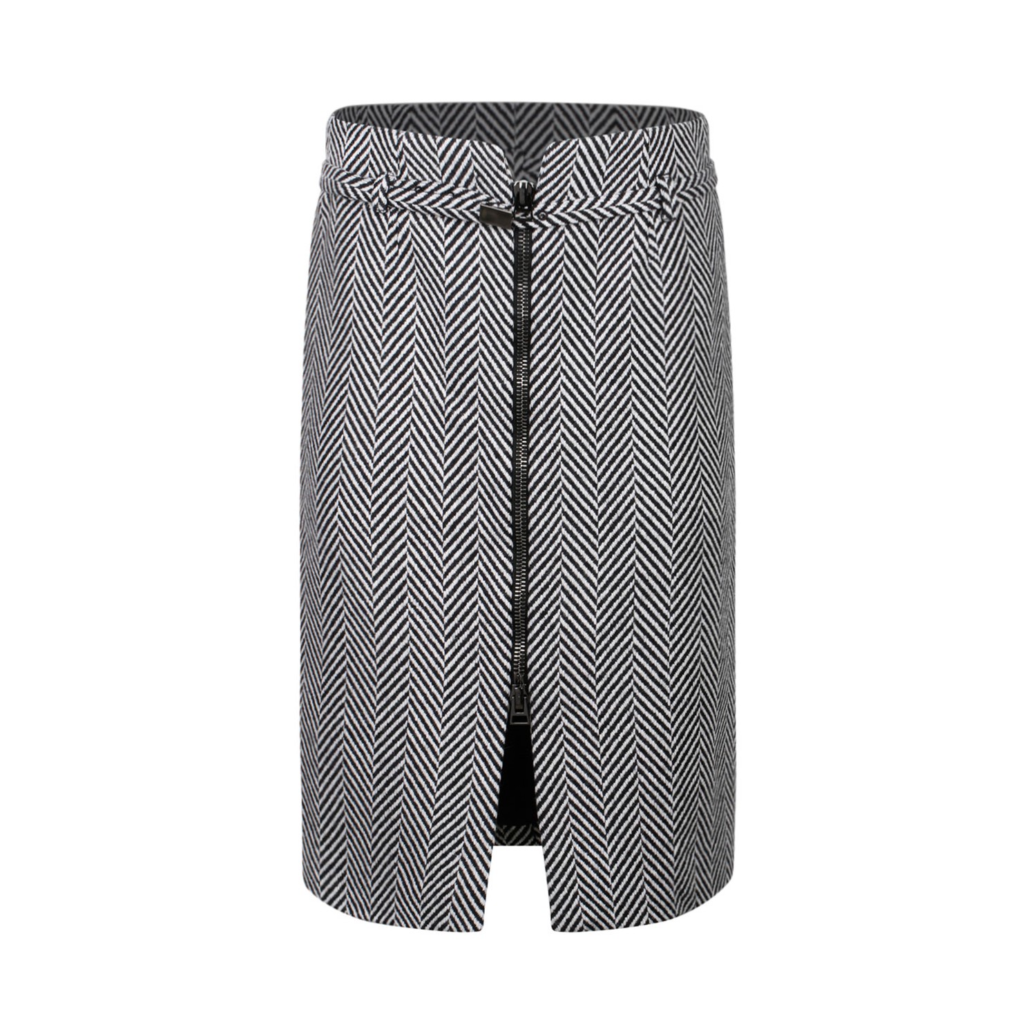 Tom Ford Black and White Virgin Wool Chevron Pattern Midi Pencil Skirt. Black and white virgin wool skirt, chevron knit, belted waist, front zip fastening, pencil design, above knee length.