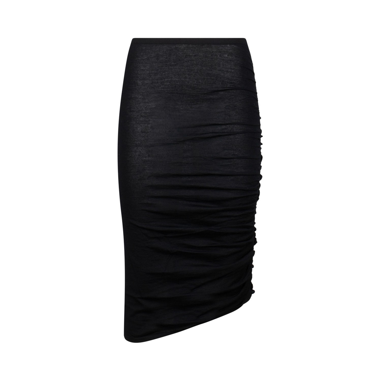 Isabel Marant Black Ruched Midi Skirt. Black merino wool midi skirt, ruched detailing, high waist, asymmetric hem.