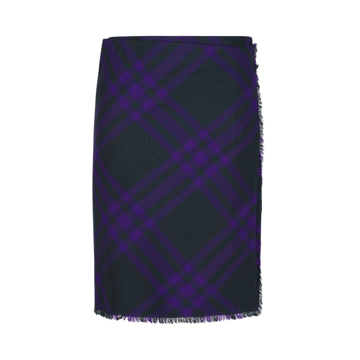 Burberry Vintage Check Wool Straight Skirt. Dark green and purple wool straight skirt with Vintage Check pattern, frayed edge. Side buckle fastening, straight hem and thigh-length.