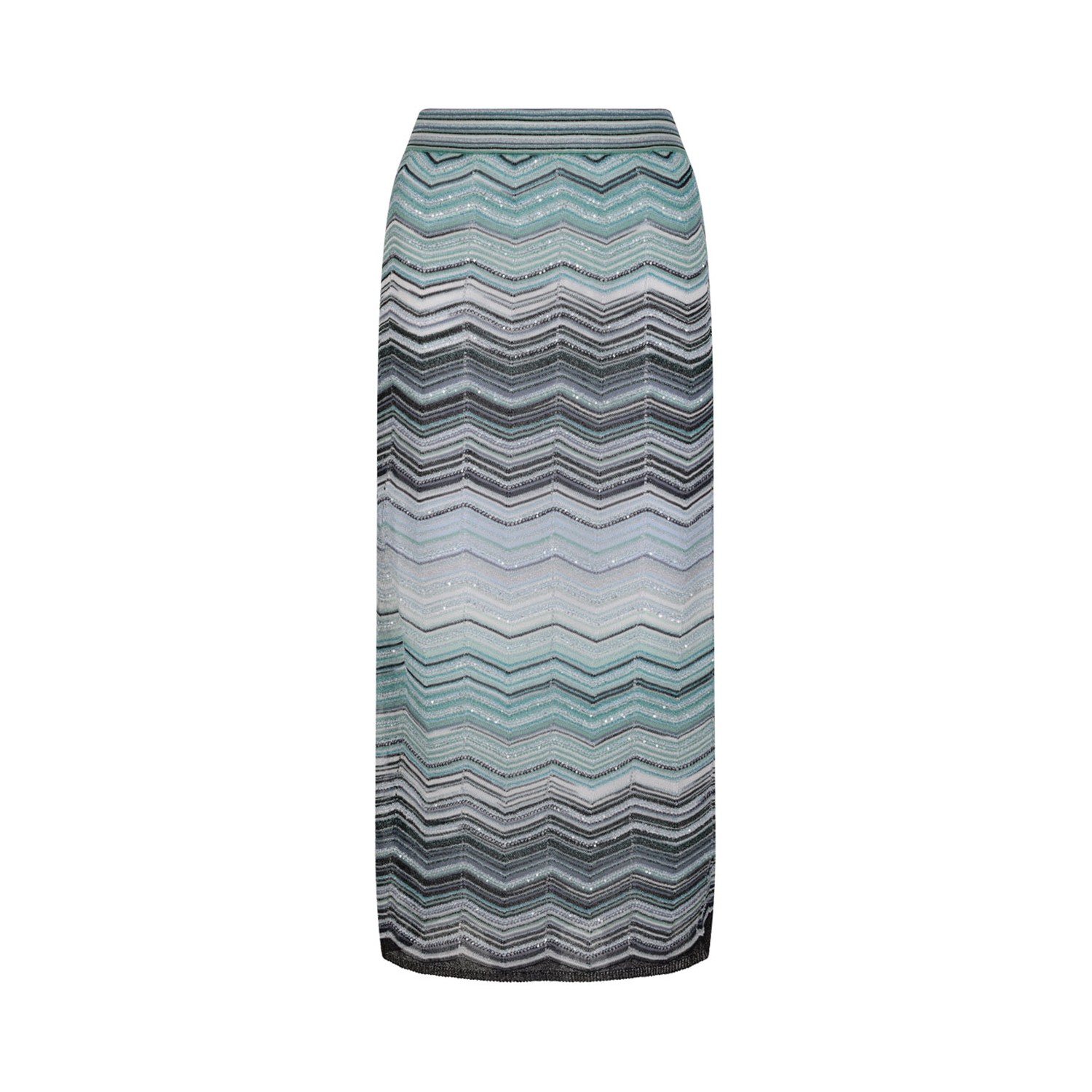 Missoni Turquoise Long Pencil Skirt. Turquoise long pencil skirt in viscose lame with chevron processing and application of sequins.