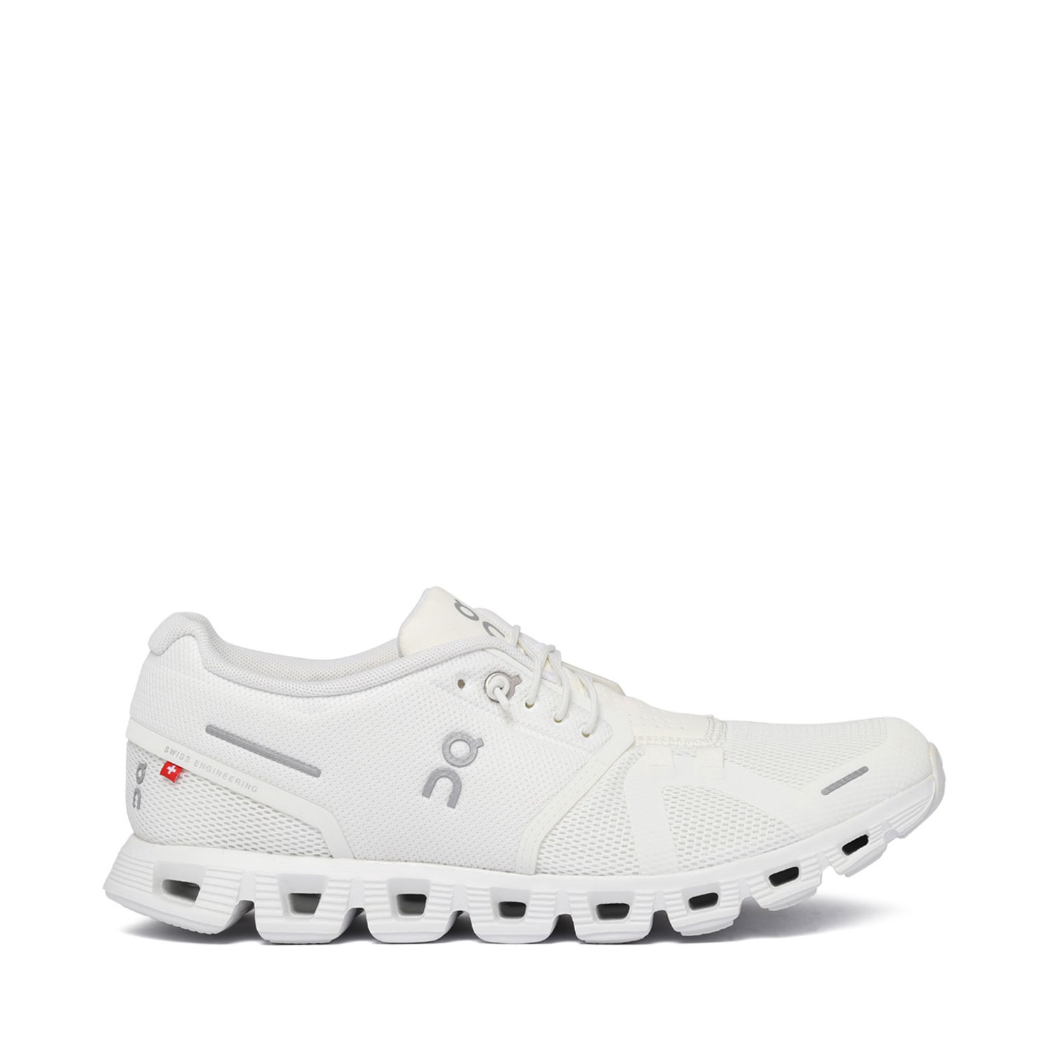 On Shoes White Cloud 5 Sneakers. White panelled design sneakers, tonal design, branded insole, ridged rubber sole, front lace-up fastening.