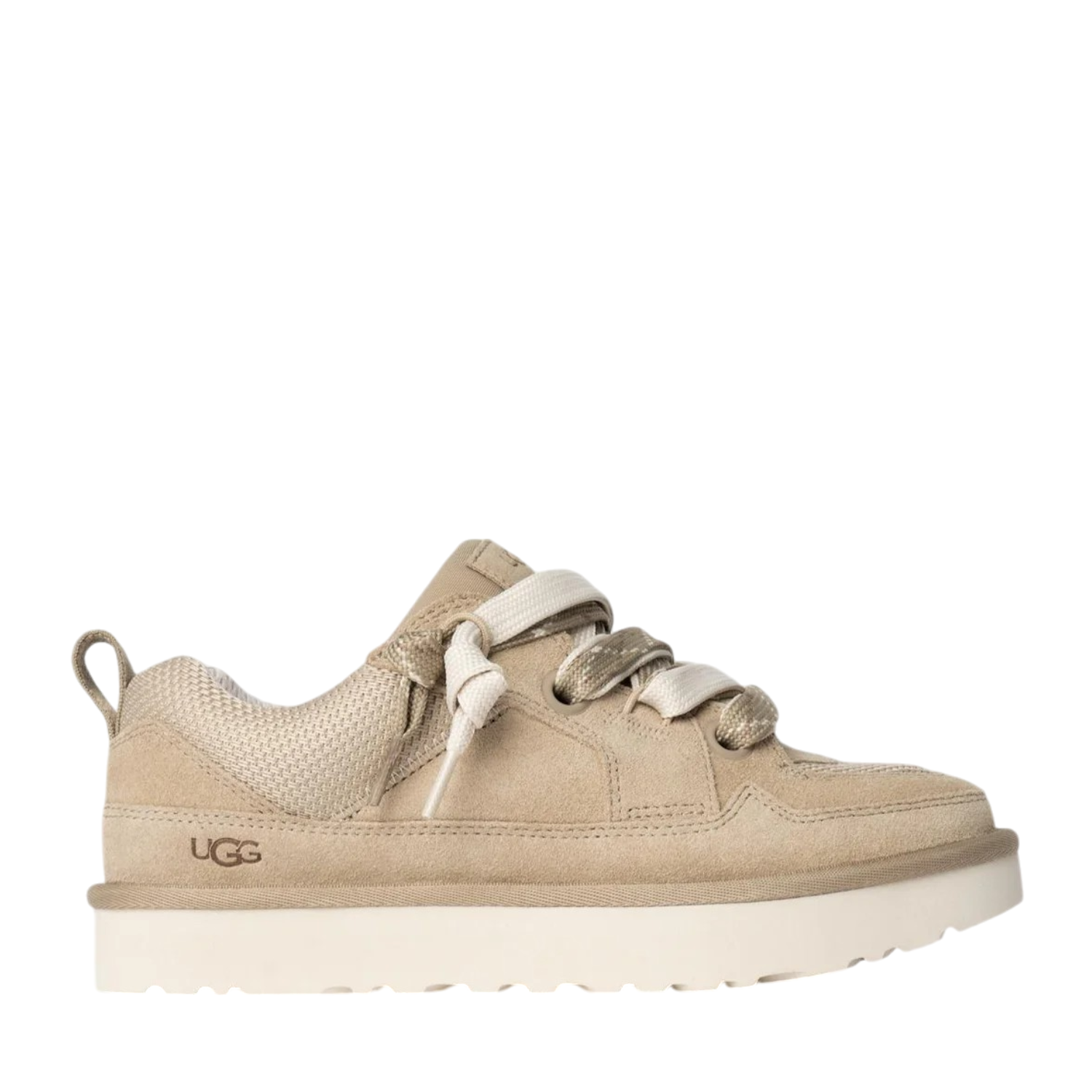 UGG Beige Lo Lowmel Sneakers. Beige suede and recycled canvas mesh upper sneakers with logo patch, oversized padded tongue.