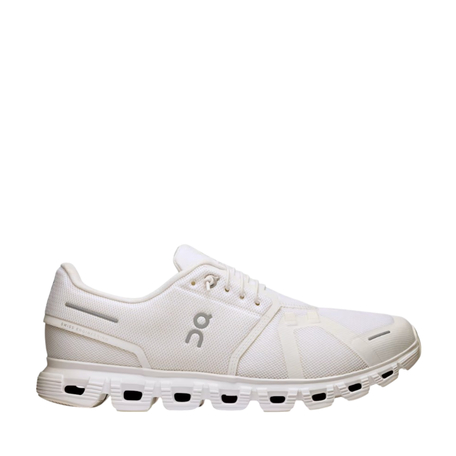 On Shoes White Cloud 6. White all-day sneaker with a new water-repellent finish, CloudTec in Zero-Gravity for exceptional cushioning. The iconic look of Cloud 6, plus even higher performance, speedboard designed for performance and 24/7 support. New insole for easier fit, wider opening, more accommodating, updated shape, structure and volume.
