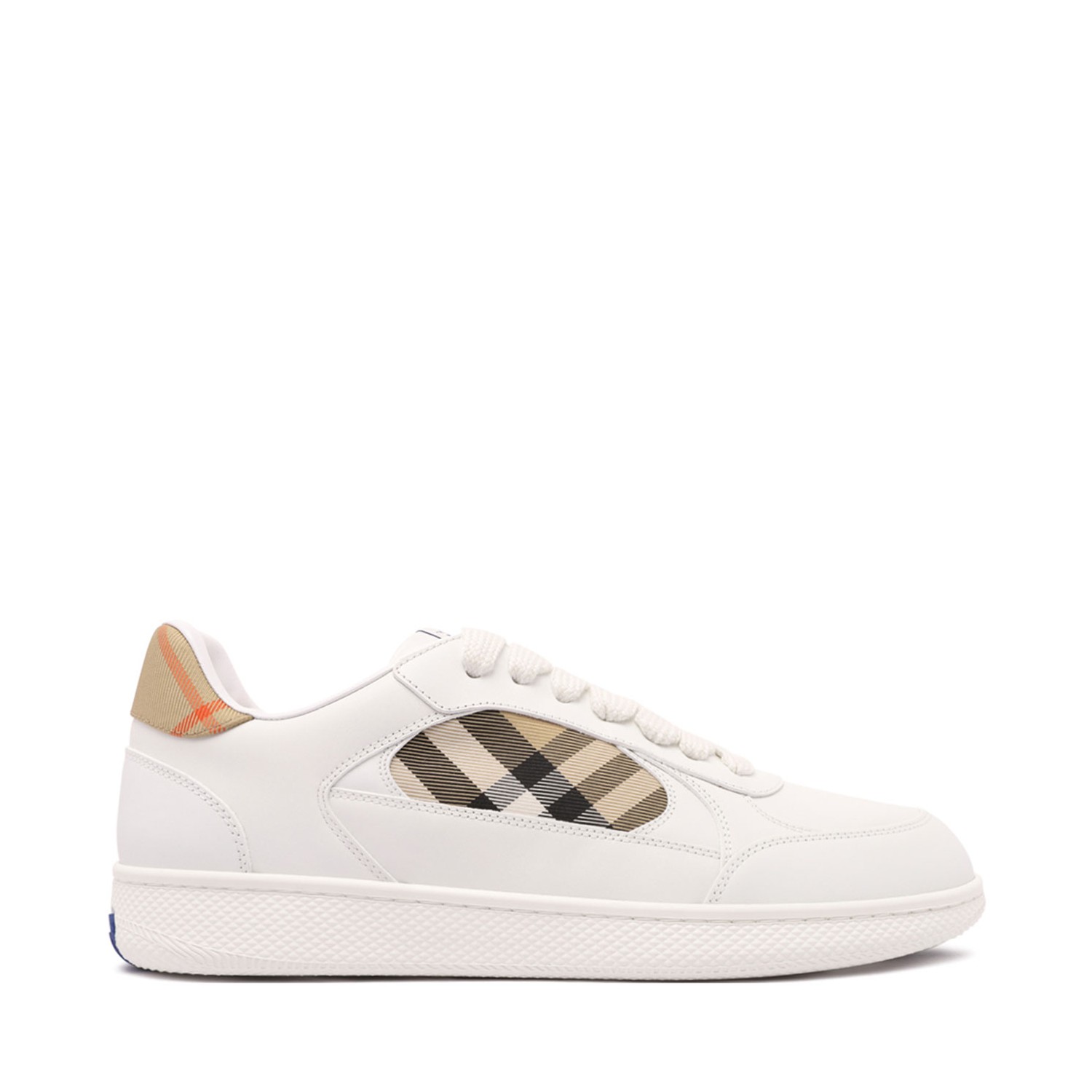 Bueberry Leather and Check Terrace Sneakers?. Italian-made sneakers in smooth calf leather, with a contrasting cuff and side panel woven with the Burberry Check in our signature sand colourway. The style features an Equestrian Knight Design label and the soles are moulded with archive Burberry lettering.