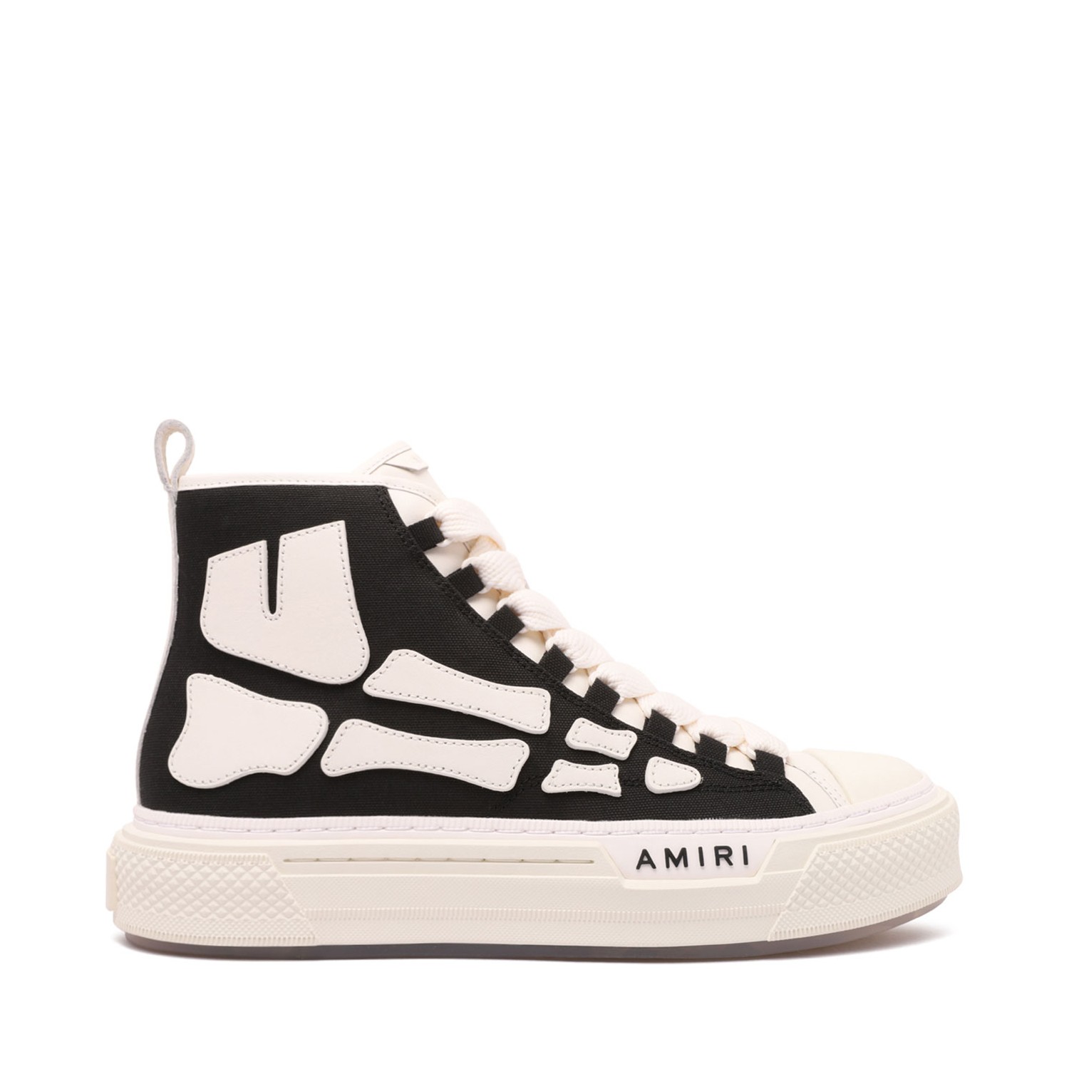 Amiri Black Skel Court Hi. Black Court Hi sneakers with skel detailing and leather bones applique. Molded rubber outsole with a canvas upper and leather bone appliques.