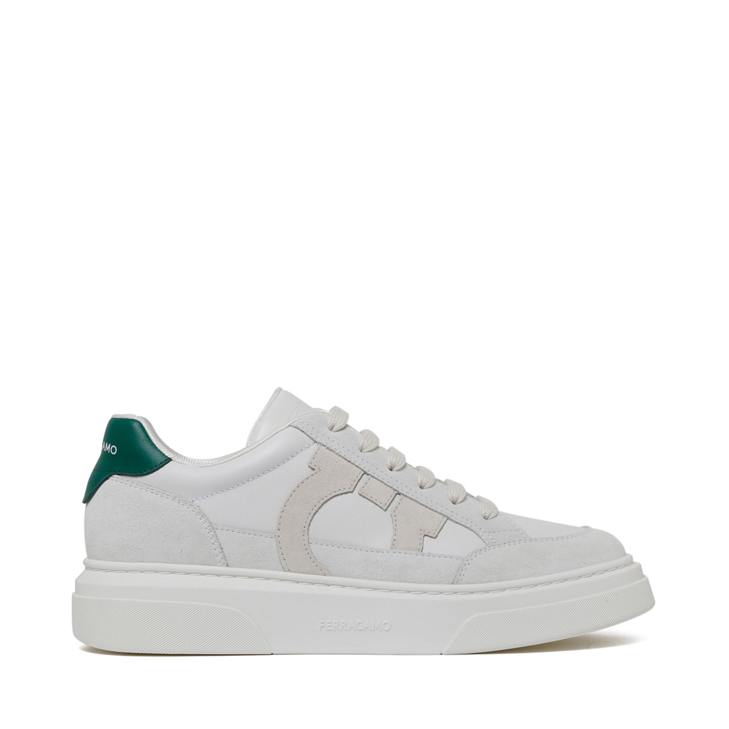 Ferragamo White and Green Cassina Sneakers. White and green leather sneakers, front fastening, logo details and rubber sole.