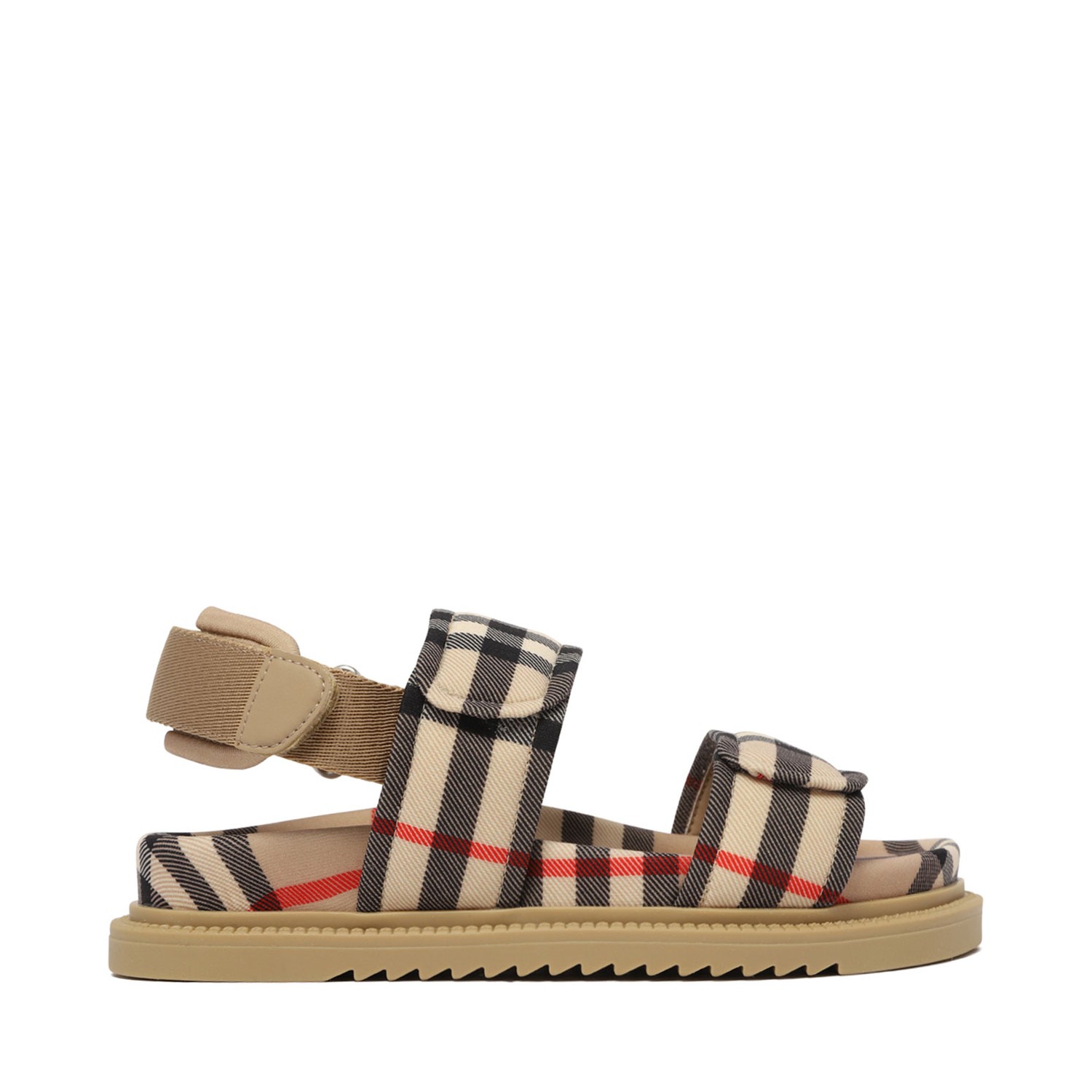 Burberry Kids Vintage Check Sandals. Archive beige flat sandals, Vintage Check pattern, touch strap fastening. Round open toe, branded insole, flat rubber sole.