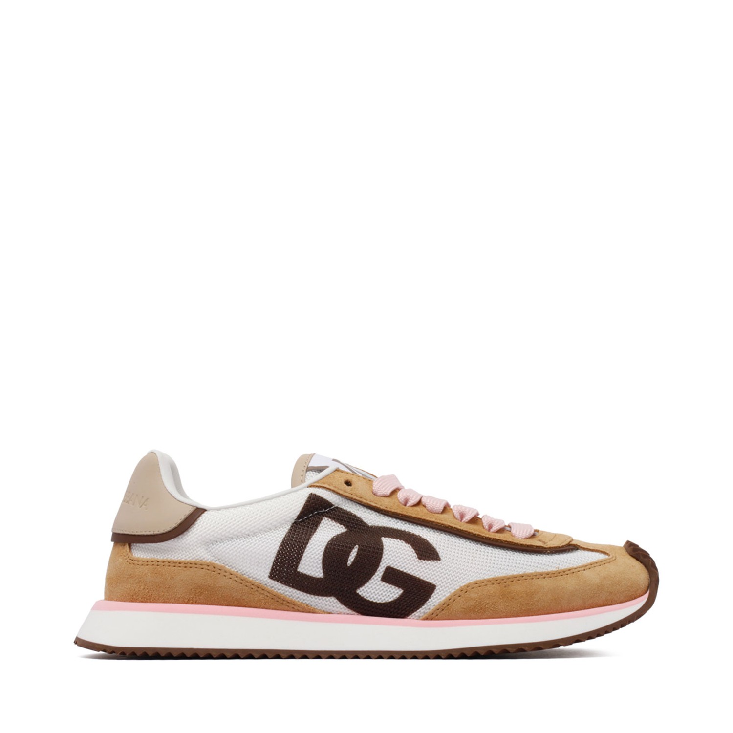 Dolce & Gabbana DG Cushion Sneakers. White and beige low top sneakers, flat laces, branded tongue. Footbed with embossed logo and rubber sole.