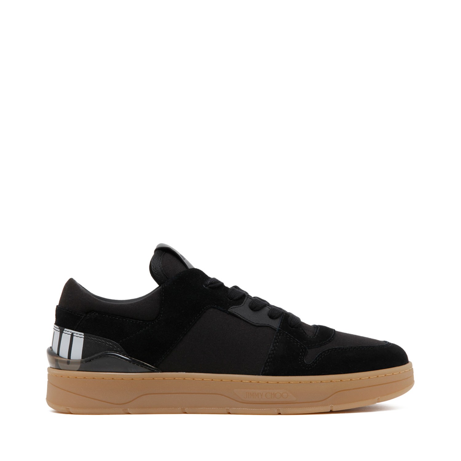 Jimmy Choo Black Florent Sneakers. Black, honey and brown calf leather sneakers, panelled design, logo print to the rear, logo patch at the tongue. Round toe, front lace-up fastening, branded insole, flat rubber sole.