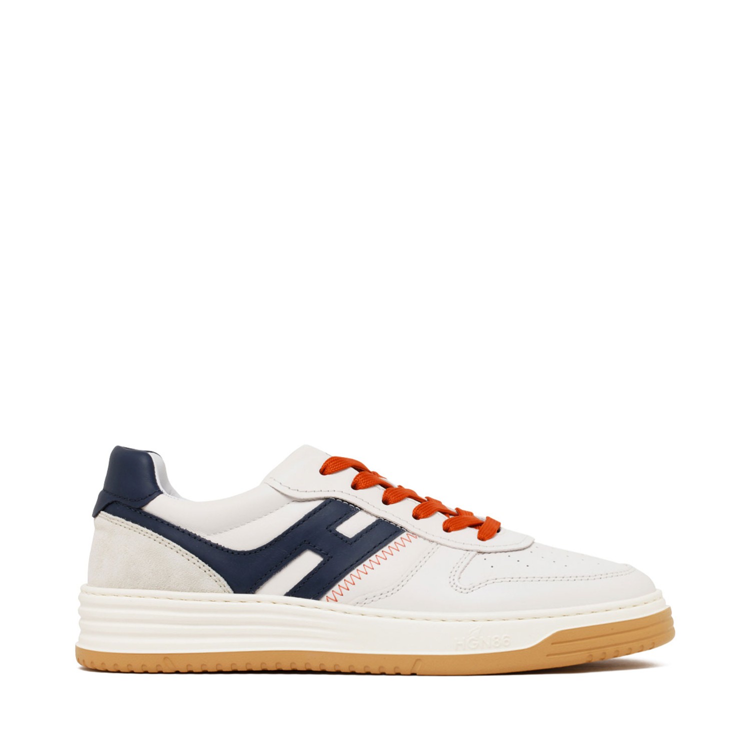 Hogan H630 Sneakers with smooth leather upper with suede inserts, featuring an elongated blue H that goes around the heel. Extralight EVA sole with embossed logo on the side and shaded stripes. Rubber outsole. Closure with orange laces. Rubber sole.
