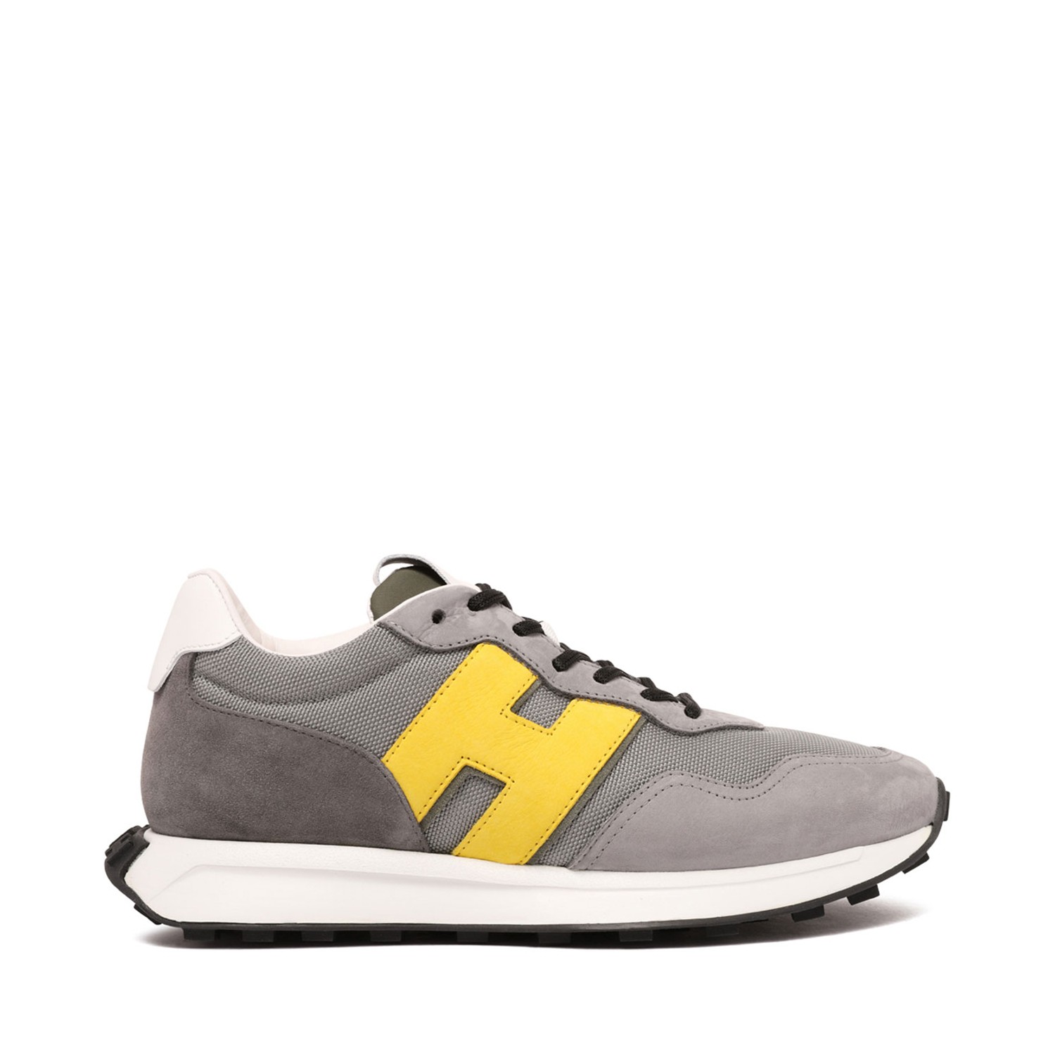 Hogan H601 Sneakers. Grey suede sneakers with panelling mesh, panelling yellow 'H' logo patch to the side. Round toe, front lace-up fastening, logo patch at the tongue. H-shaped spikes at the outsole, branded insole, memory foam insole and flat sole.