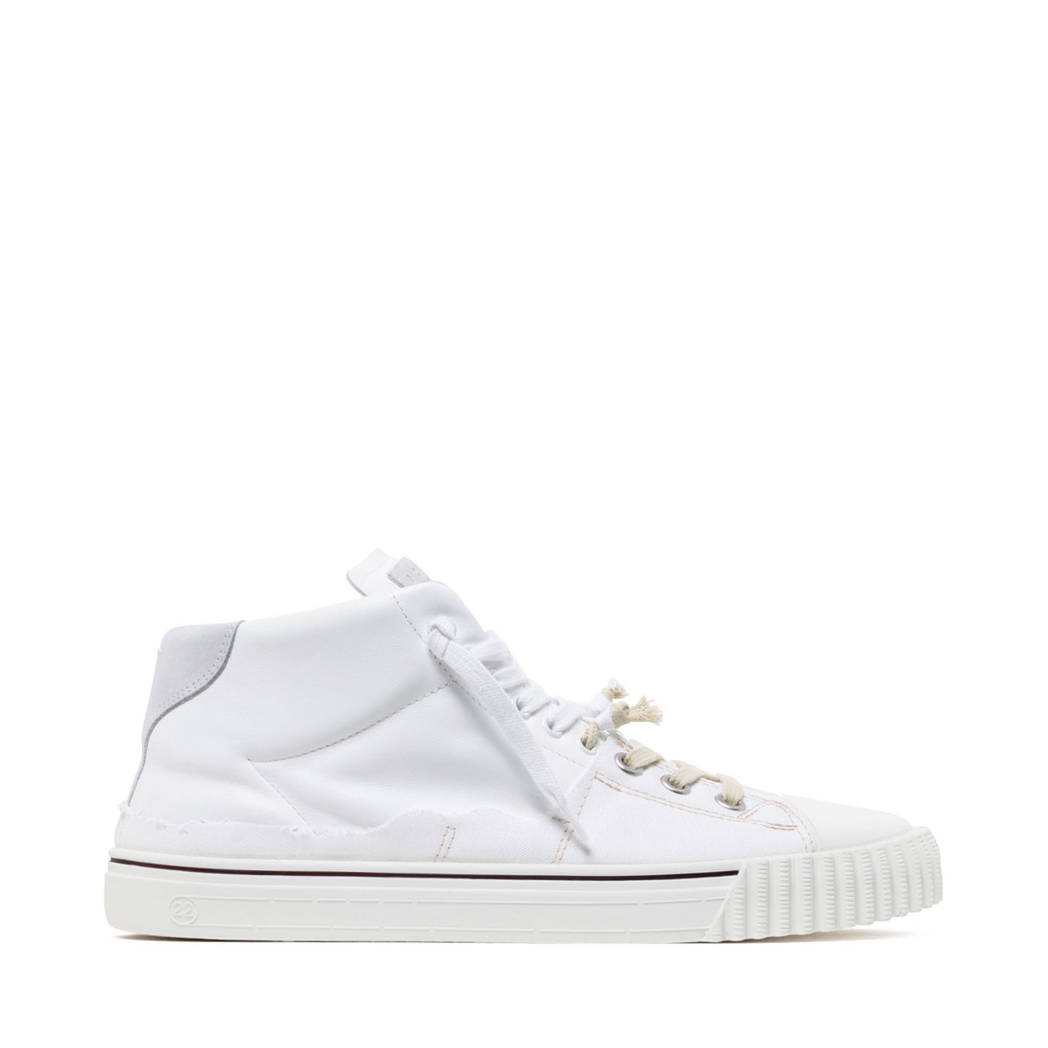 Maison Margiela White New Evolution Sneakers. White canvas, calfskin and suede sneakers. Front lace up fastening, peeled by laser, souble stringa decorated, logo label on the tongue. White stitching on the back, all over logo on the insole.