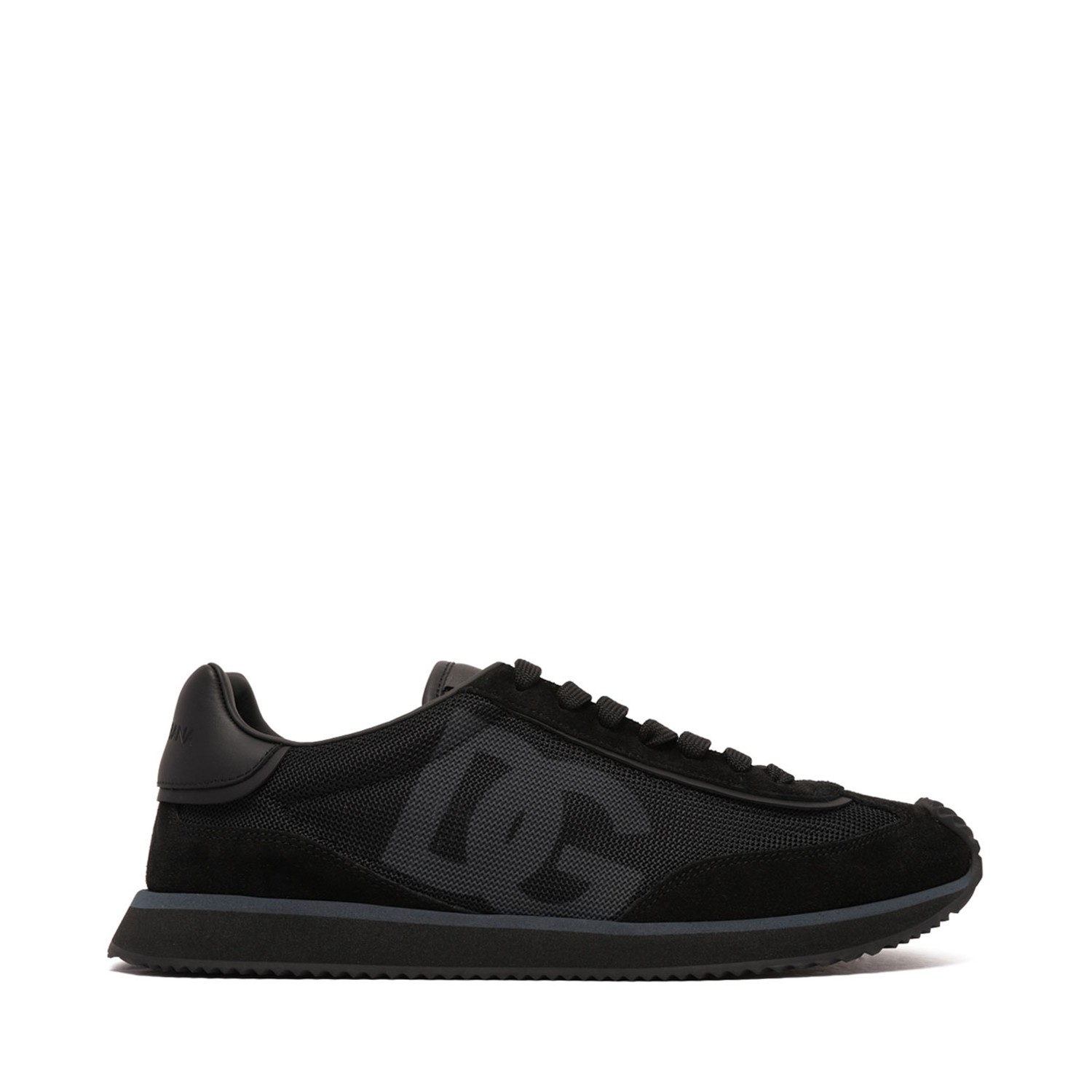 Dolce & Gabbana Black DG Cushion Sneakers. Black mixed-material sneakers with front lace-up fastening, logo patch at the tongue, branded leather insole and flat rubber sole.