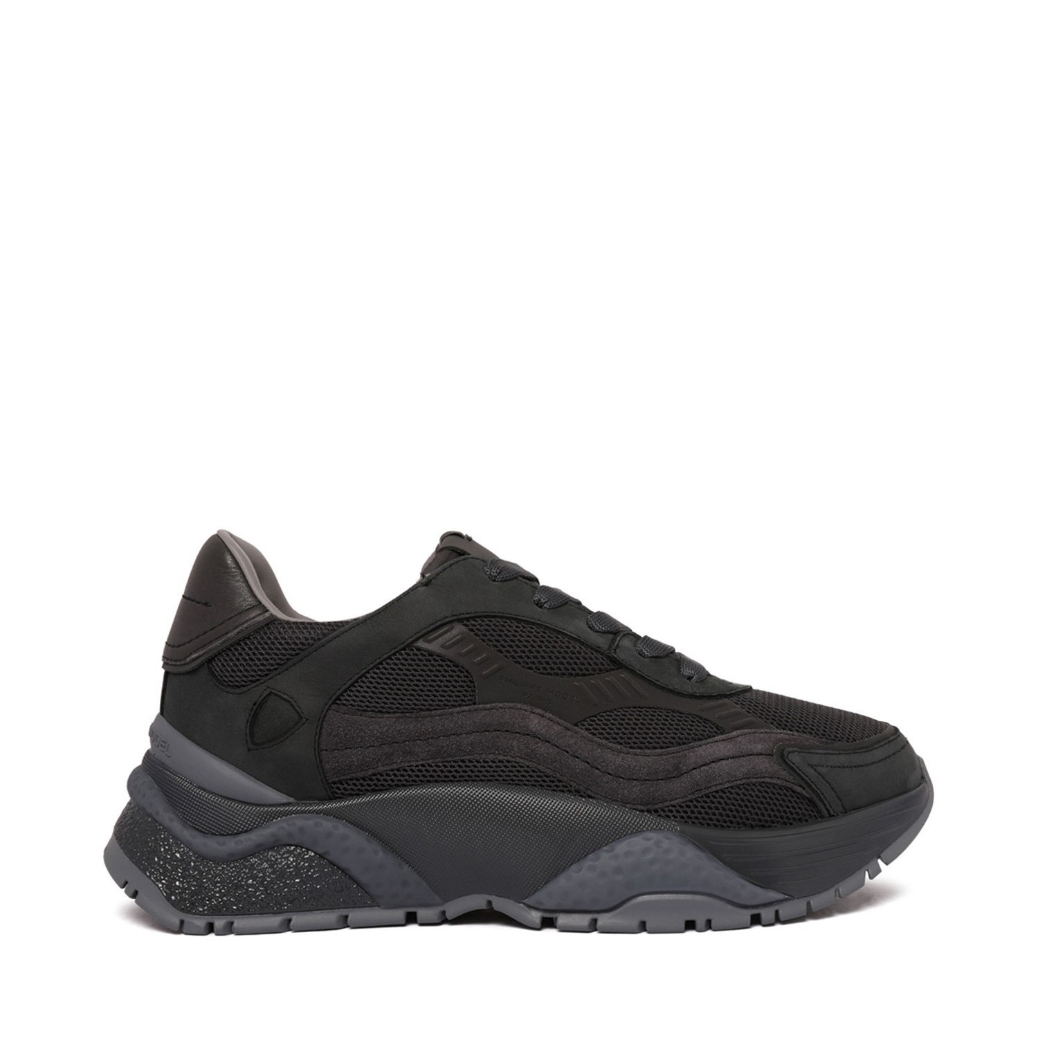 Philippe Model Black Odeon Sneakers. Black low-top sneakers crafted from a mix of mesh, suede, and smooth leather. Featuring layered panel construction with wave detailing, tonal laces, and a sculpted chunky rubber sole. Contrast textures and matte finishes lend a technical, contemporary edge. Embossed logo details, padded collar, and performance-inspired silhouette complete the design.